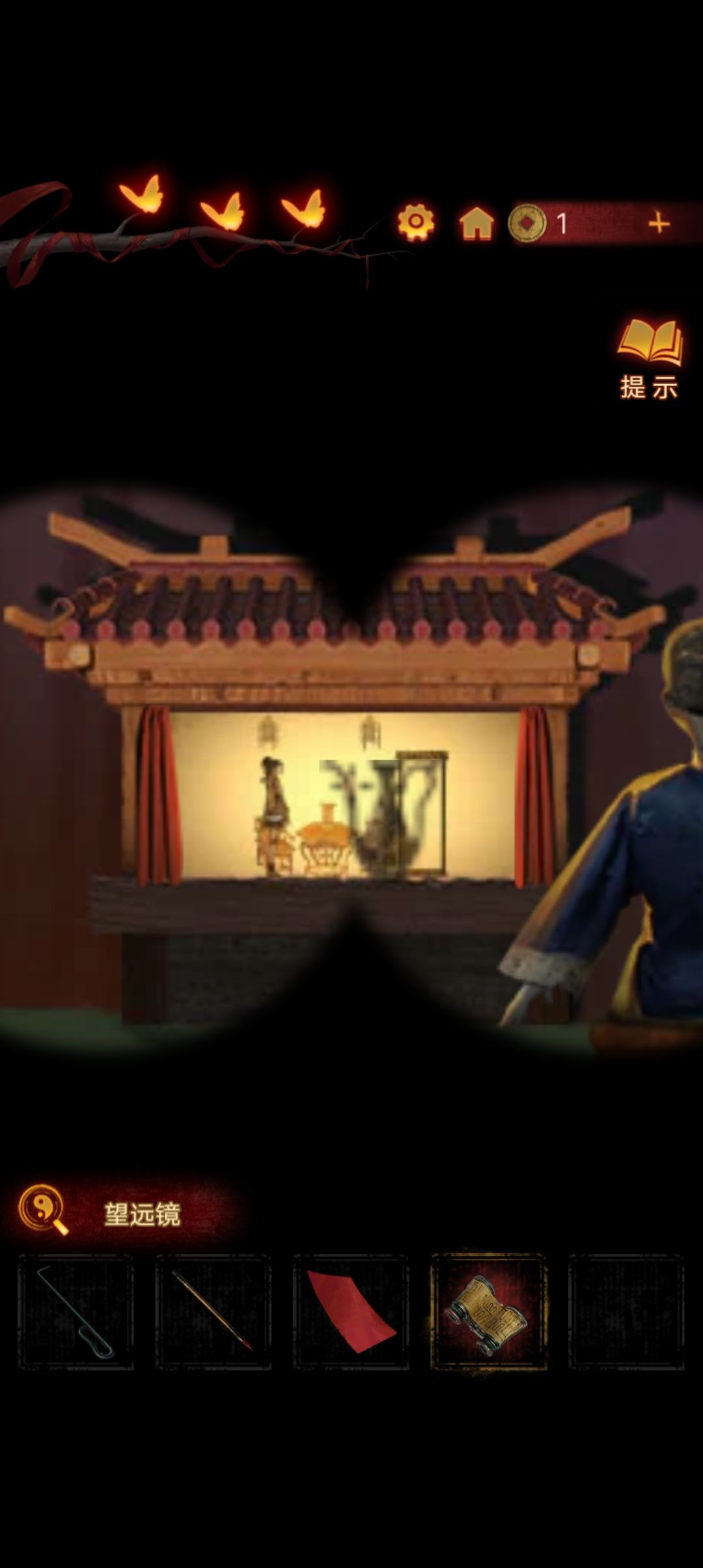 来到楼上戏台,用望远镜查看皮影戏