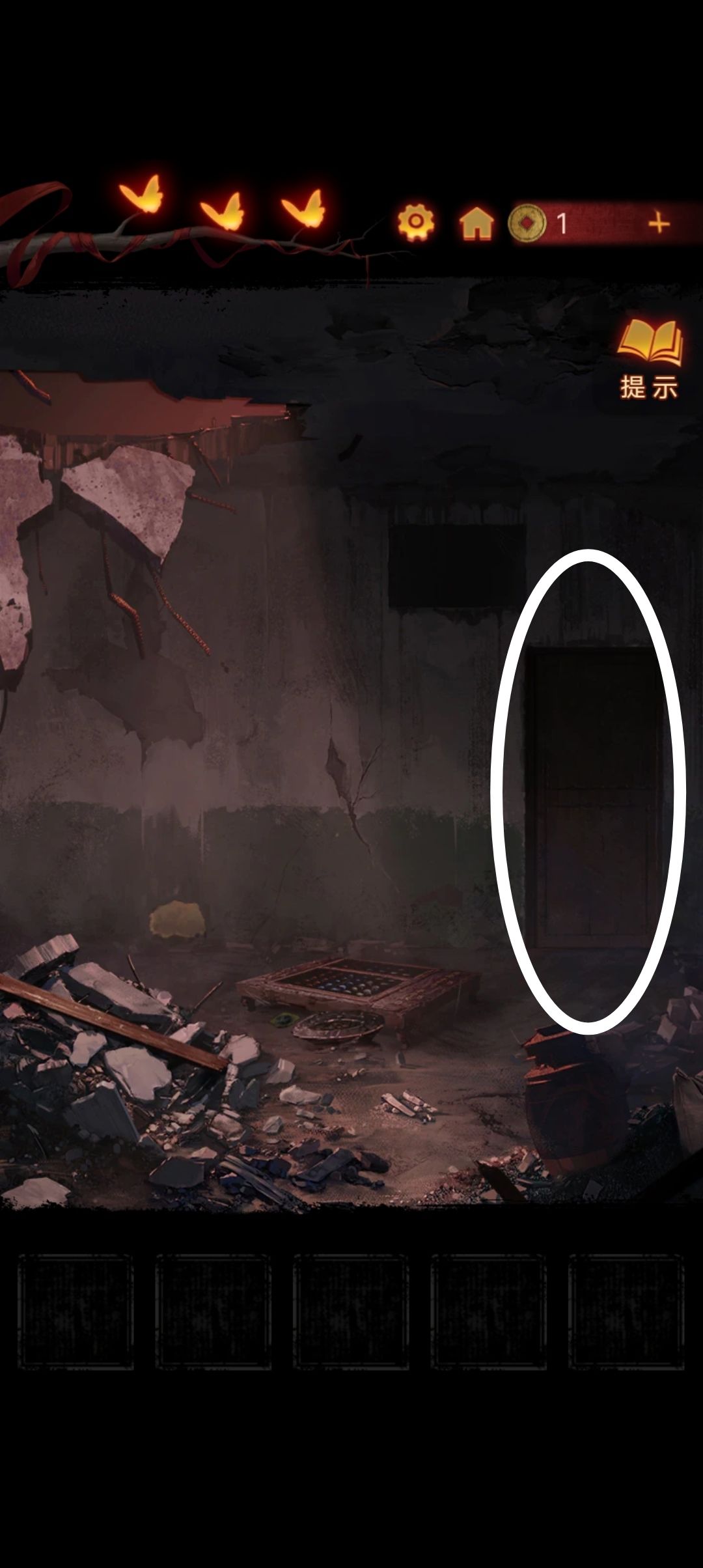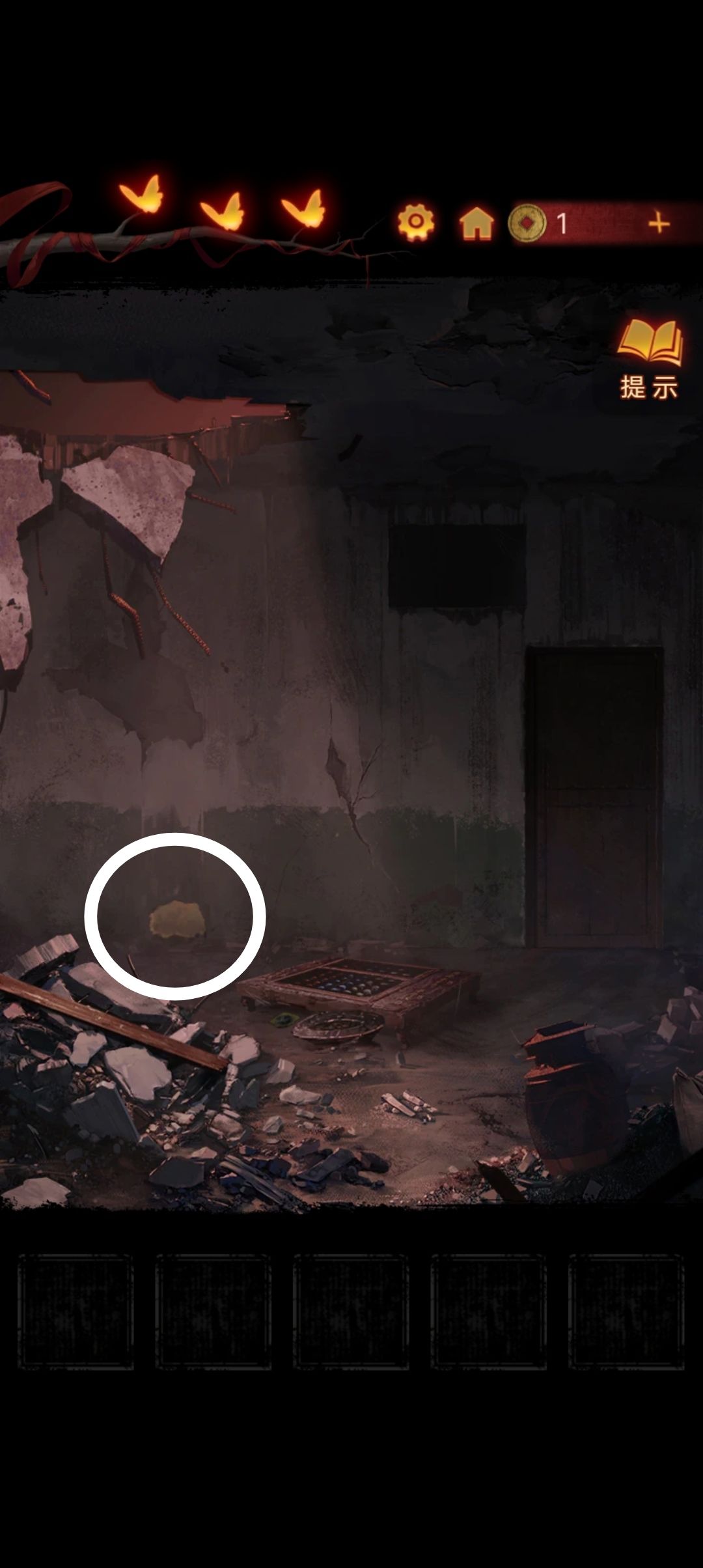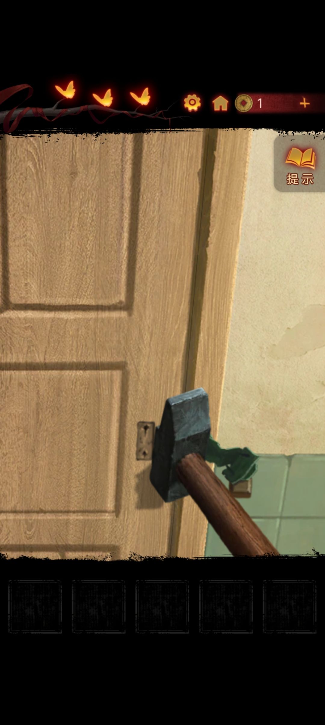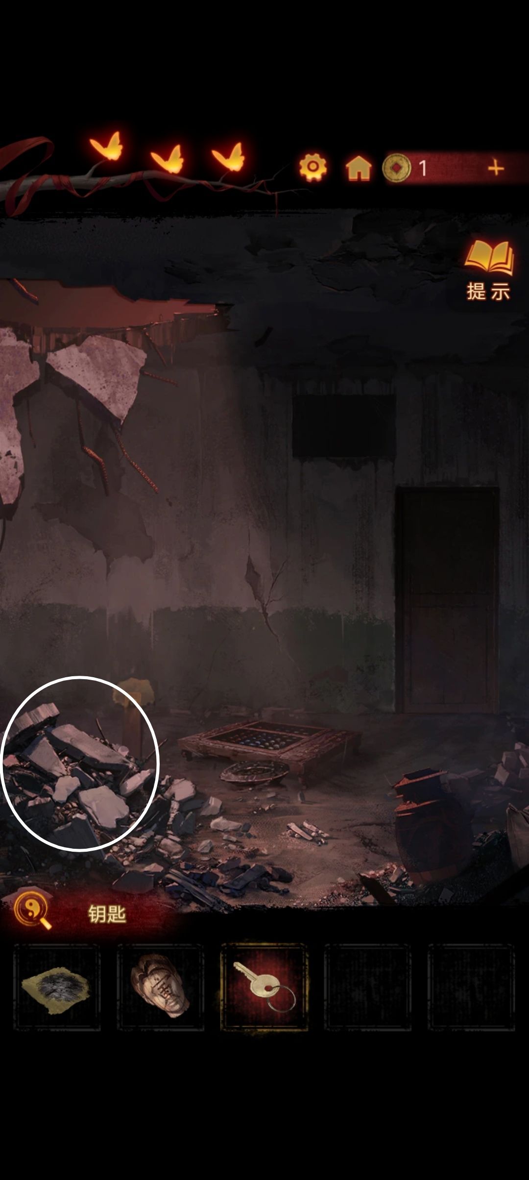 点击墙上的小洞,把木板放进去,用碎石块把小六砸下来『顺便断个头』拿到钥匙