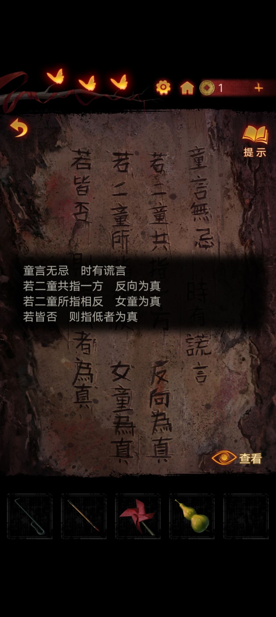 在树上拿到一个葫芦,点击树干查看线索,然后上楼『分析举例:两人都指左边,那么正确方向是右;如果一个指左一个指右,那么女童指的方向是正确的;如果一个指上一个指右,那么正确方向是右,以此类推』