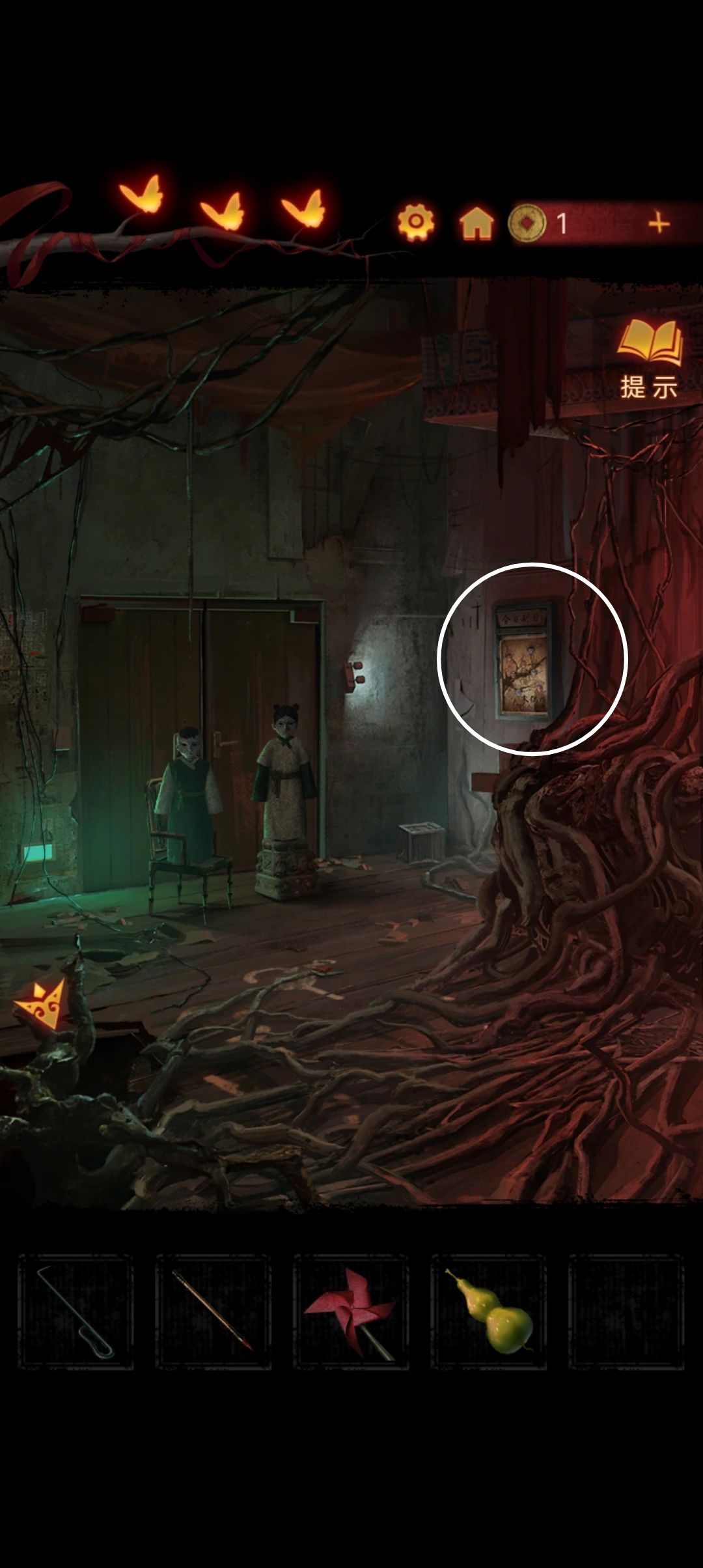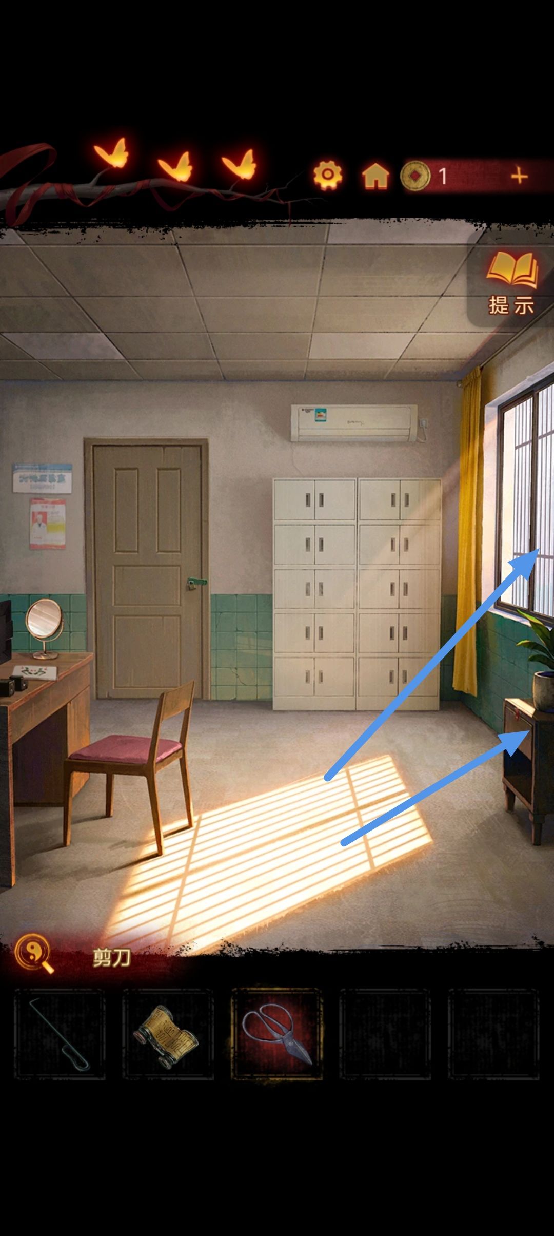 过完剧情后分别点击右侧的柜子和窗户,分别用剪刀和铁钩子拿到两张卡片