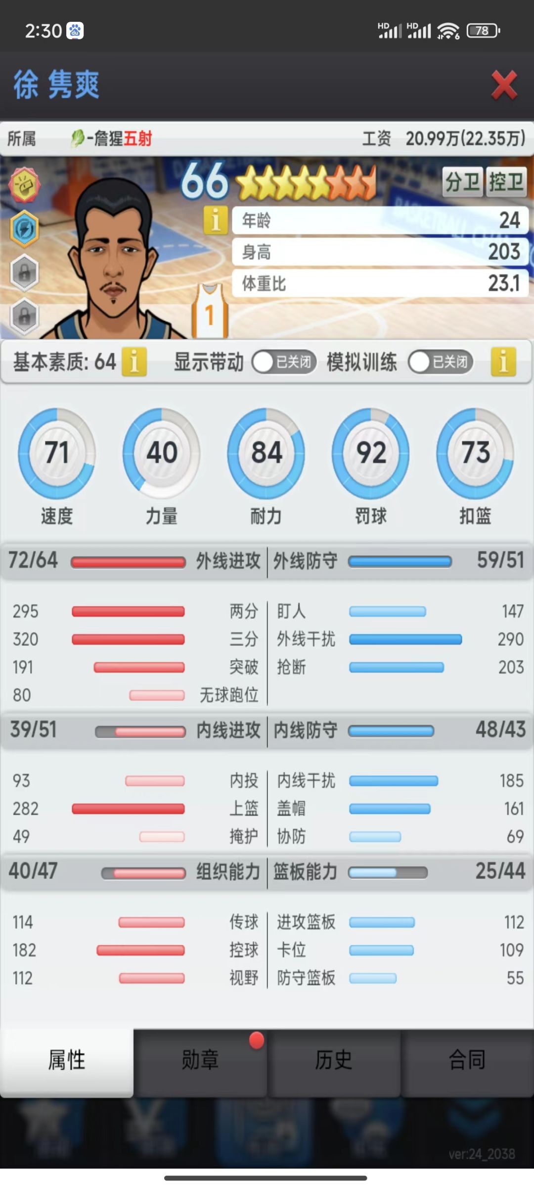 1、速度不要低于40+,外防和抢断要求可以低一些但不少于200,内防250+协防200+盖帽可以200+也可以低一些,篮板卡位和前板为主,最好280+。
