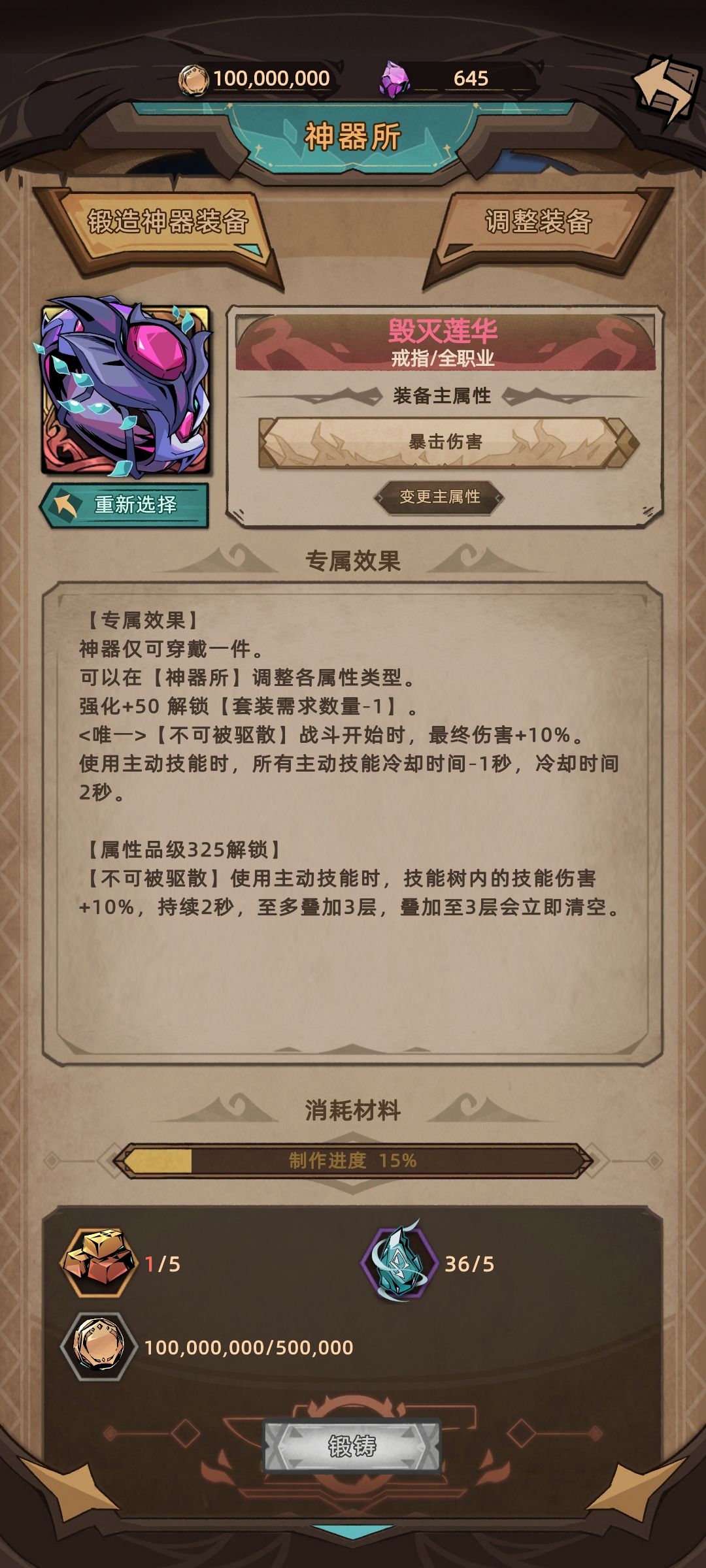 神器是挺好做的,但是神器强化50才有套装减1效果,就算全强化戒指短时间内也难到50,这时候只需要用神器戒指替换掉未升阶的首饰戒指,这时候会少3全技能和15%最终伤害,但是神器戒指的效果比这3全技能更高,而且全技能还能用词条补回来。