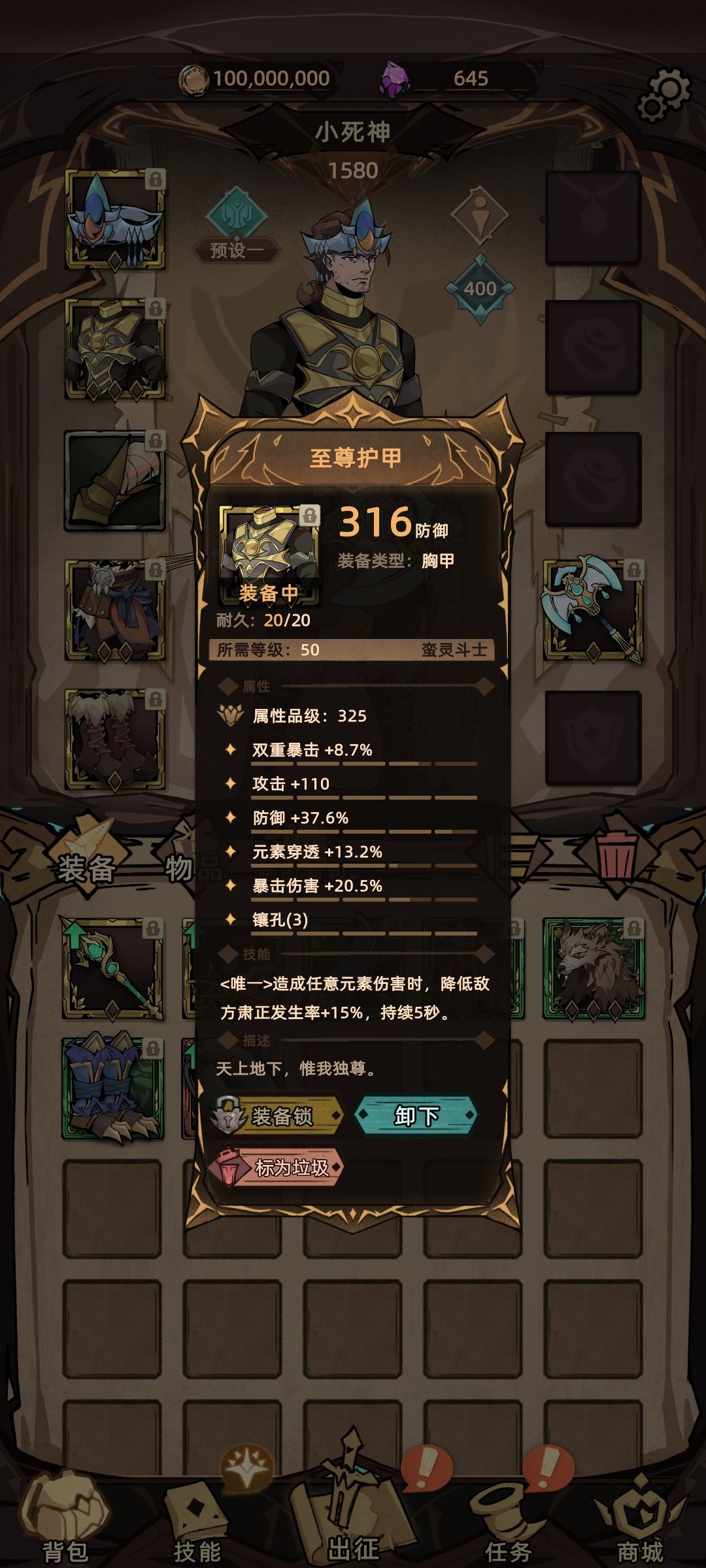 把防具套装的衣服替换为暗金衣服【至尊护甲】,这个衣服的所有属性都是我们需要的,加的也都不低。