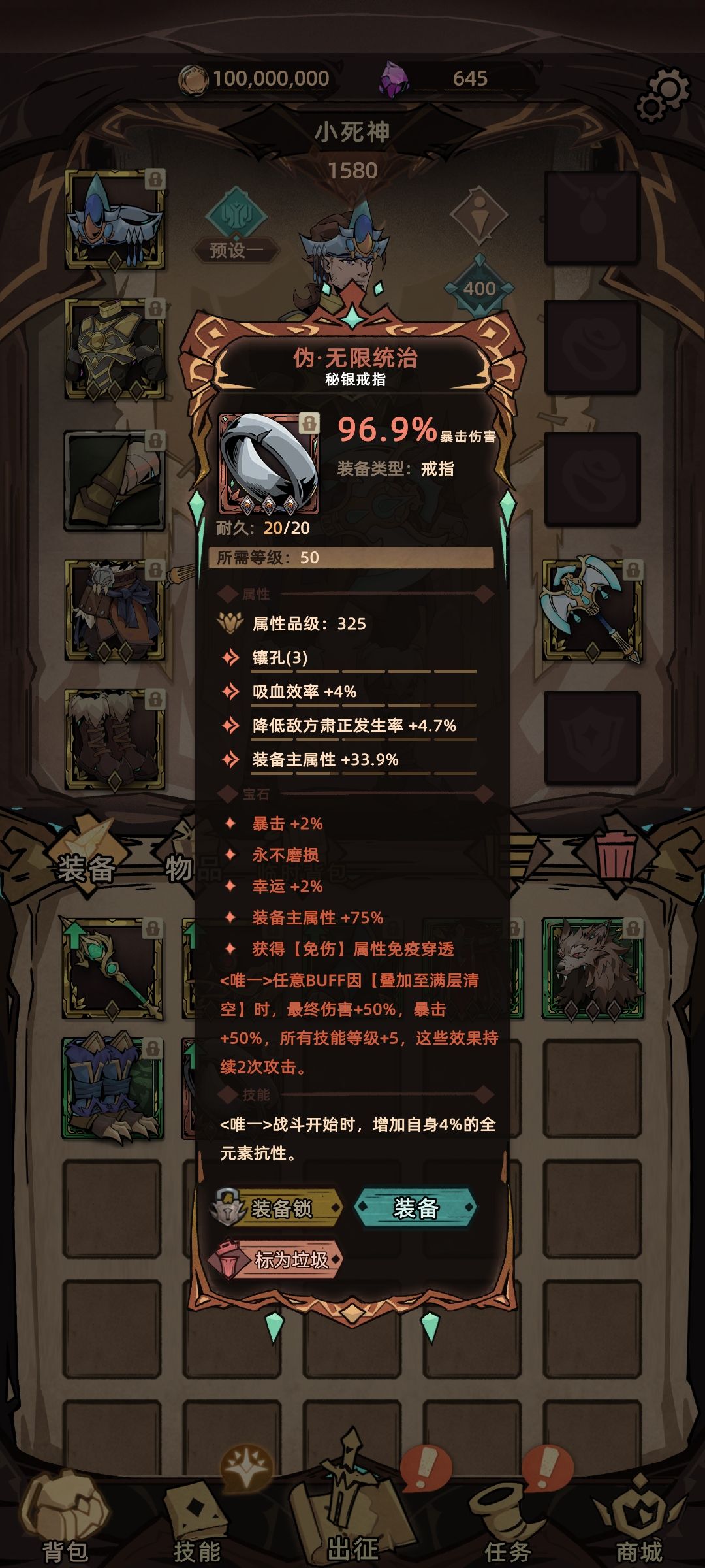 最后再来说说大家比较关心的全技能等级,减1戒指配装下【伪·无限统治】5级,防具套装2级,首饰套装2级,武器强化1级,神器词条2级,其余装备词条只需要找出来3级全技能即可,如果镶嵌传奇宝石完美华冠,只需要1条全技能等级+2就行了,1个词条和450生命值自己取舍吧。