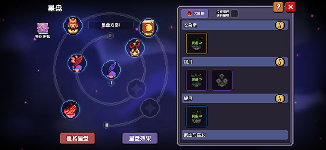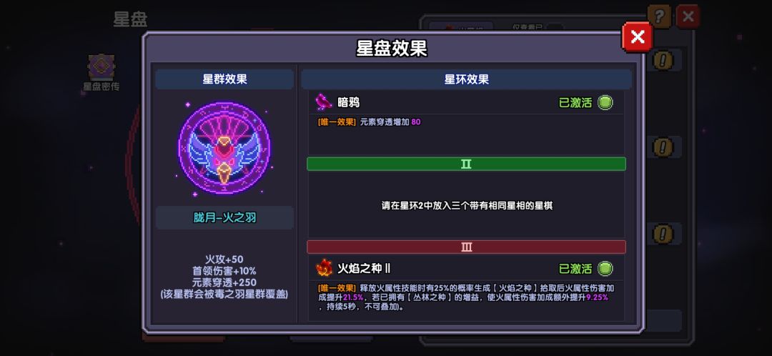 胧月系列星棋按图中放置,即可激活星群效果,最外环补2个”火星相”棋子,要是缺的话就去打造,同样是造最便宜的