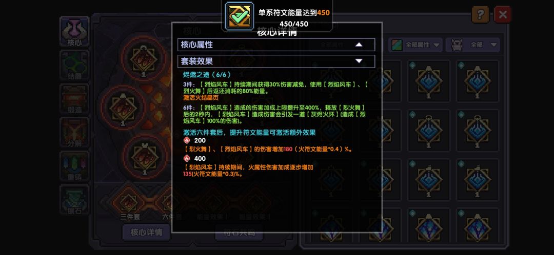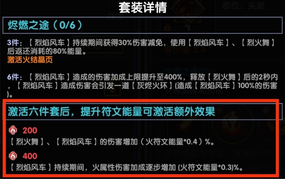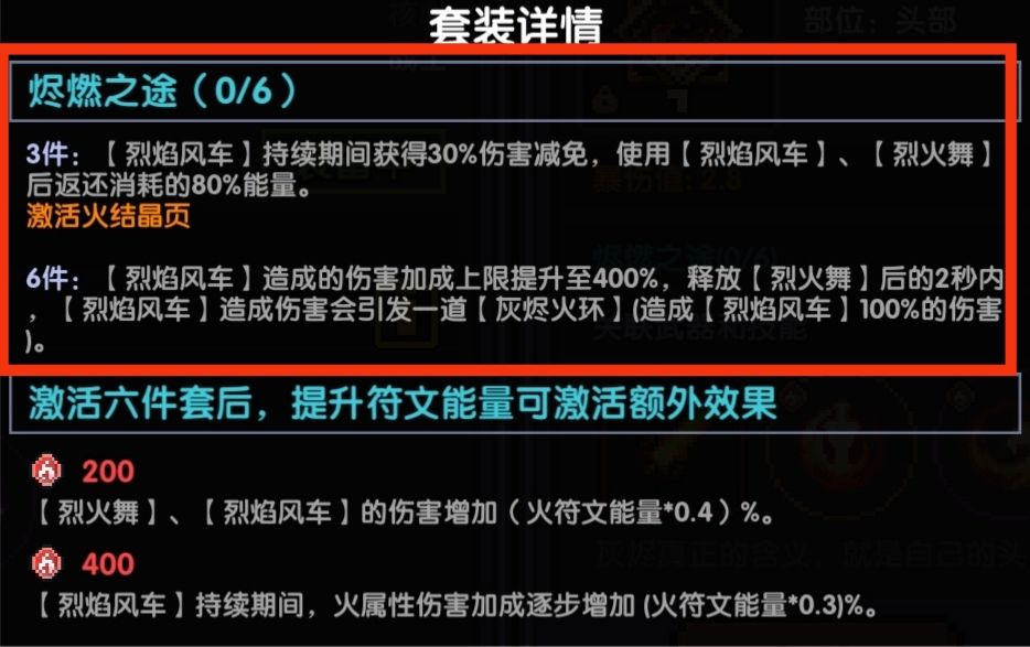 集齐“头部”、“披风”、“衣服”、“项链”、“戒指”、“鞋子”六个部位的核心(旧称呼是“大符文”)之后,即可激活“烬燃之途6件套”效果,很大程度上改变该bd的机制,对伤害也有很大提升