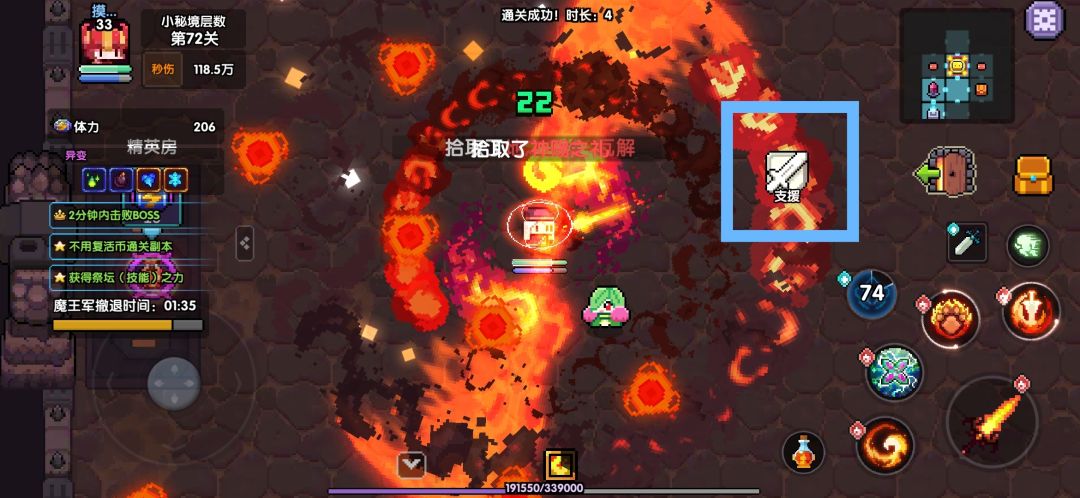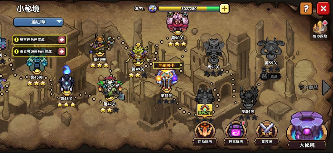 小秘境推图时,可以把体力留给精英怪(红圈),可以掉落装备和宝石