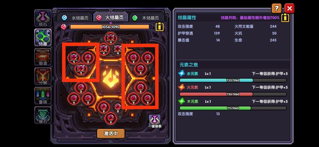 火结晶页,建议都换成“暴击值”(闪电图标)和“护甲穿透”(下箭头图标),可见红框部分