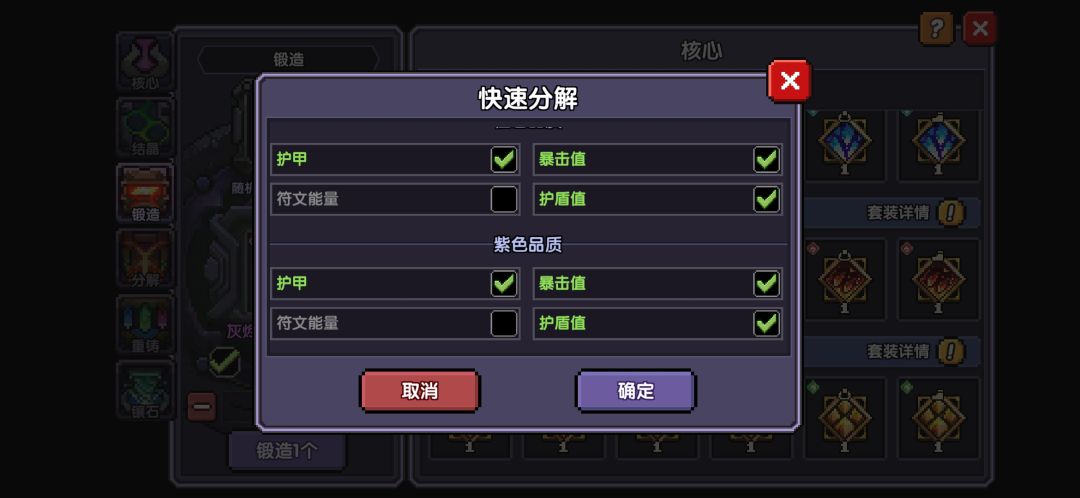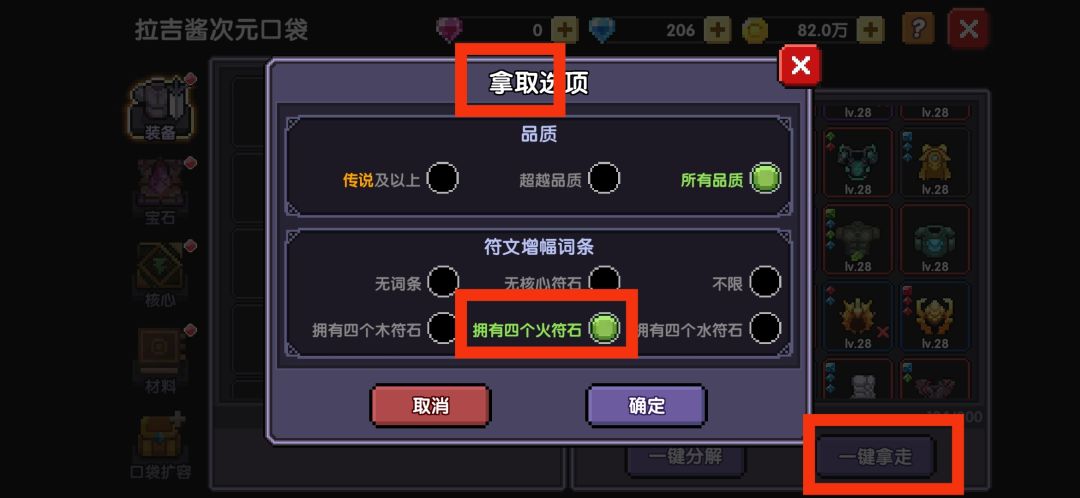 红框部分(衣服、鞋子),自动分解按图中所示来设置,必须为“紫色”或“橙色”的“火符文能量”
