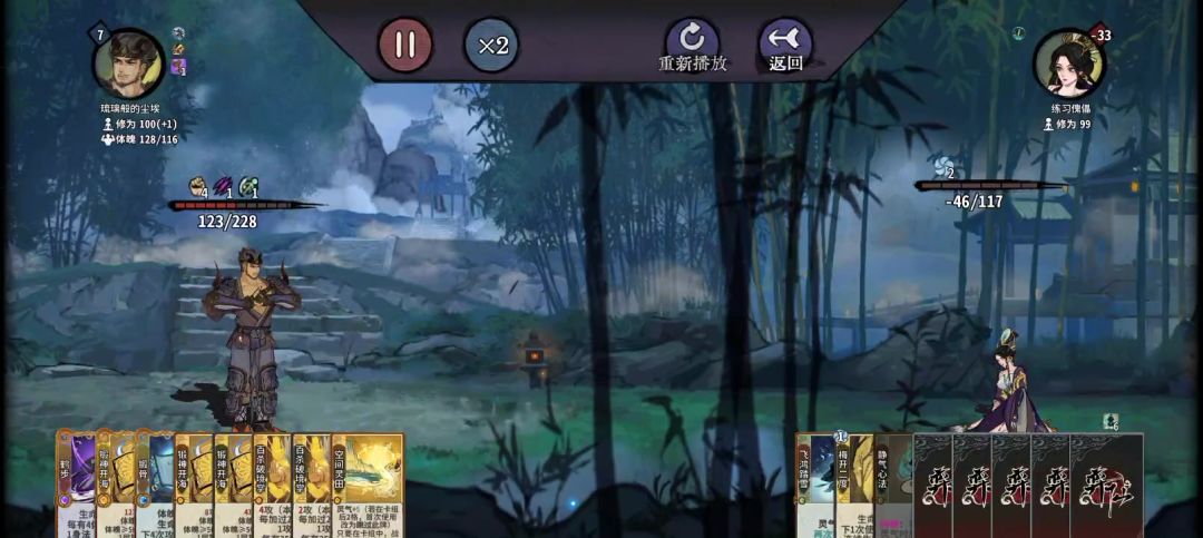 这里给不知道的玩家介绍一下科学d牌:每置换一张牌,会使牌库中该牌减少两张,牌库中每种牌都有八张。也就是说我们随着战斗进行不断替换置换掉低阶的加体魄卡,后面初始仙命就更容易来断神锻骨锻髓这些我们能用到的卡,不用费力去d,这也就是破镜掌是唯一核心卡的理由。另外,每轮第一次d牌会有更高概率来当前境界的牌。