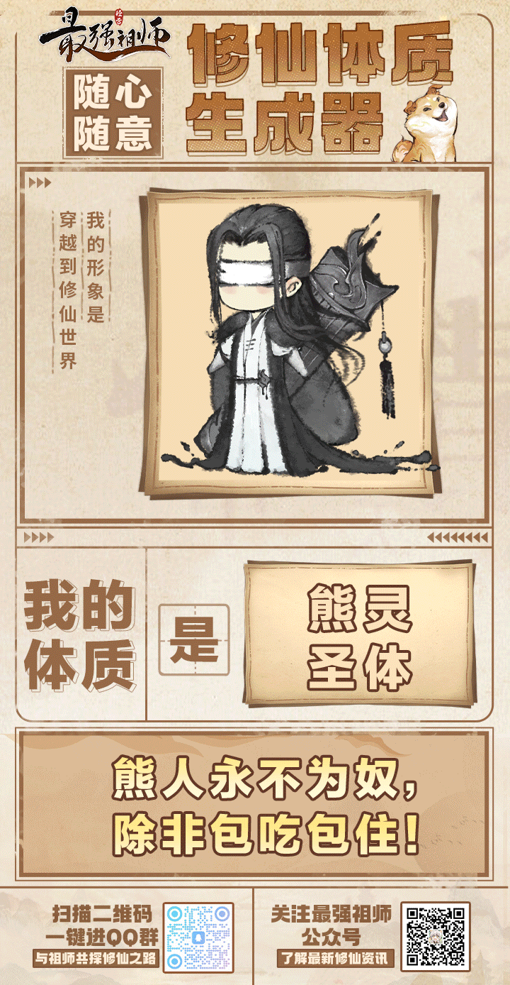 各位祖师们大家好距离《最强祖师》2月2日公测的日子越来越近今天又为大家带来新的趣味活动测一测当你穿越到修仙世界你会拥有什么体质~