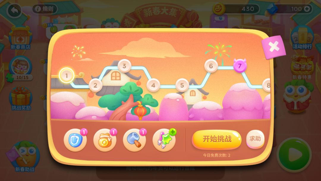 火爆出圈第一步,年货商品得备足!挑战活动关卡,将有机会获得水果、糖果、干果、和新年装饰品等。在「新春大集」活动中,可以挑战15个固定关卡和1个随机关卡,每天有2次免费挑战机会,免费的挑战次数会在每日24点刷新。