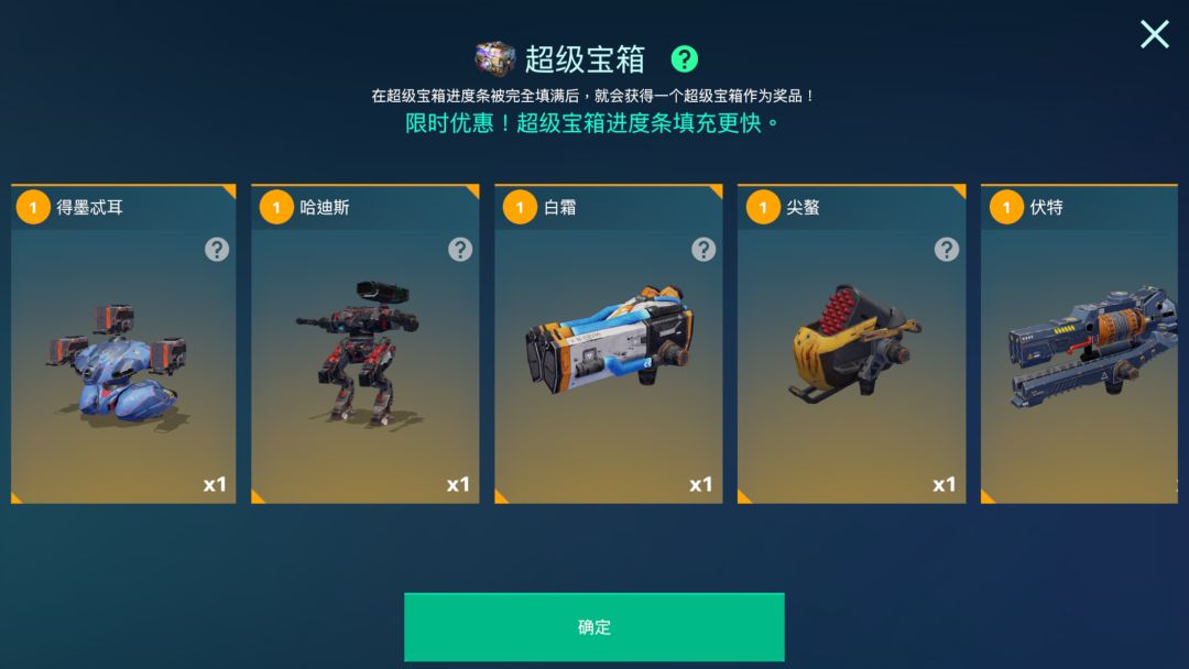 ②指挥官每次战斗结束后均可获得一定数量的钥匙币,在黑市中可以使用钥匙币开启宝箱。在抽取达到一定次数后,将获得超级宝箱,内含[幻影]、[夜莺]等强力橙色机甲以及[白霜]、[伏特]等强力橙色武器。