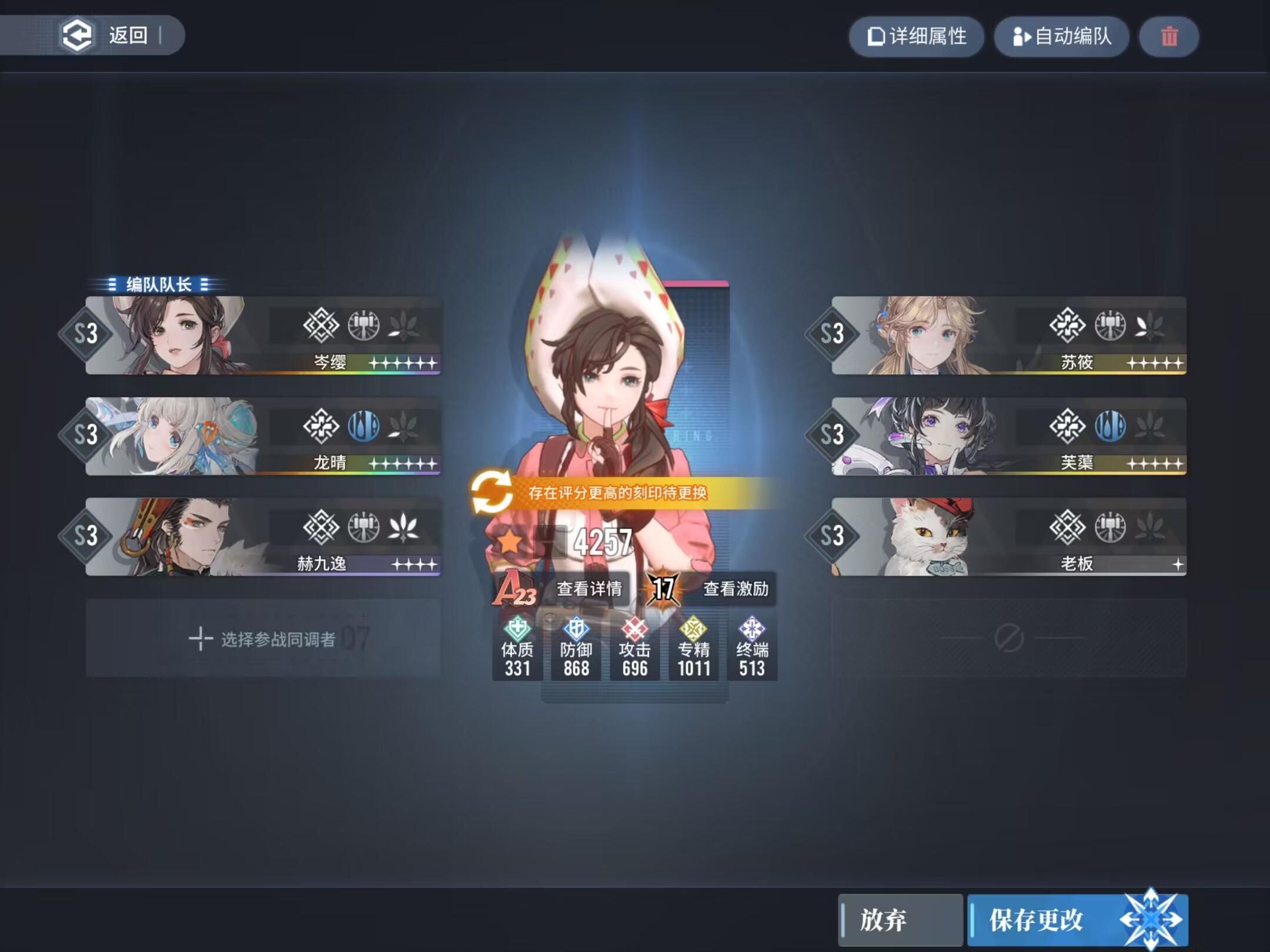 思路是先上老板减次cd换龙晴套盾叠激励,然后芙蕖龙晴在场上奶住,等到岑缨第一个大招快满了龙晴换赫九逸画符,然后放第一个大招被反死,触发苏筱被动放第二个大招游戏结束