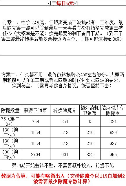 可以看出,比起0氪,每日6元达到每期300除魔4波的速度要快一期,但是缺点是剩余的卫道币并没有那么多,如果第四期换光卫道币,下一期很难达到3波的奖励。