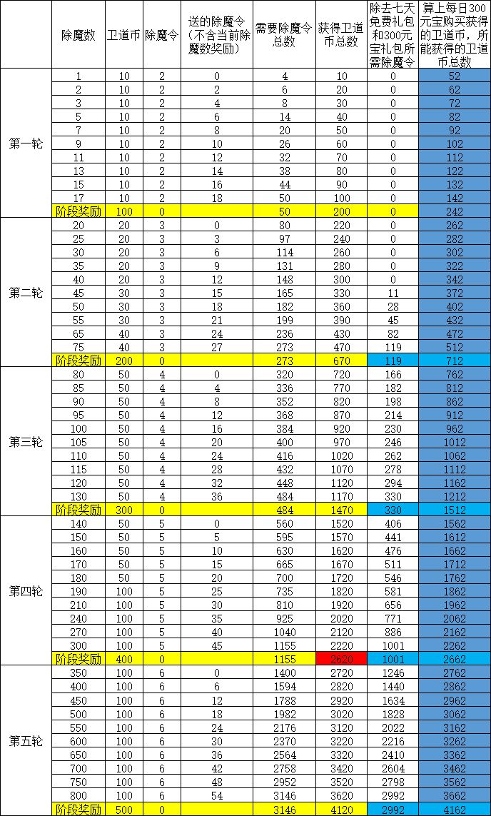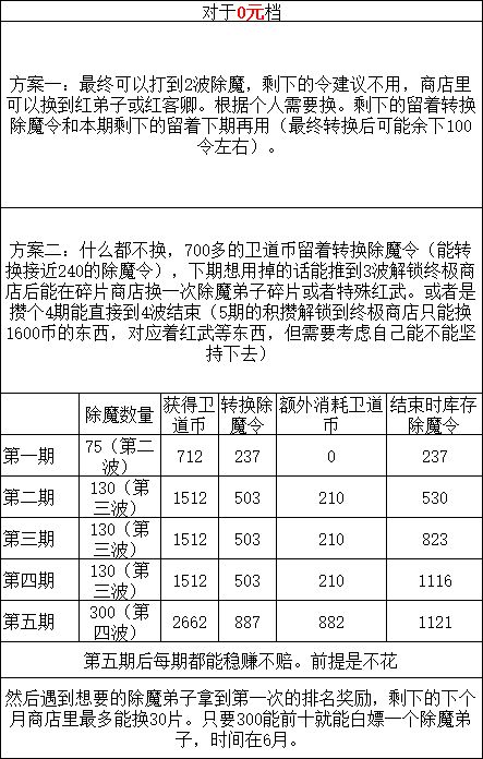这是以前期除魔0消费换取后期除魔4波高性价比的做法,周期较长。即使在第五期兑换完需要奖励,任然能余下200多除魔令,下期任然可以选择最快攒除魔令的3波除魔方案而不是从零开始。