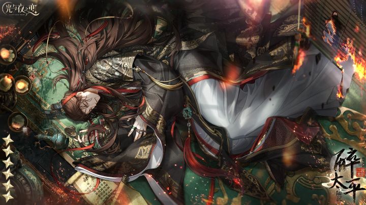 [6星]灵犀 陆沉・醉太平 属于[纪念灵犀・瑰意]系列,二段光影为特别纪念横版卡面,在游戏内灵犀详情界面,点击左上角放大镜【查看大图】即可鉴赏完整卡面。