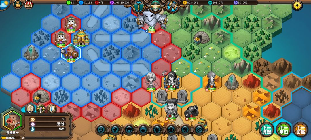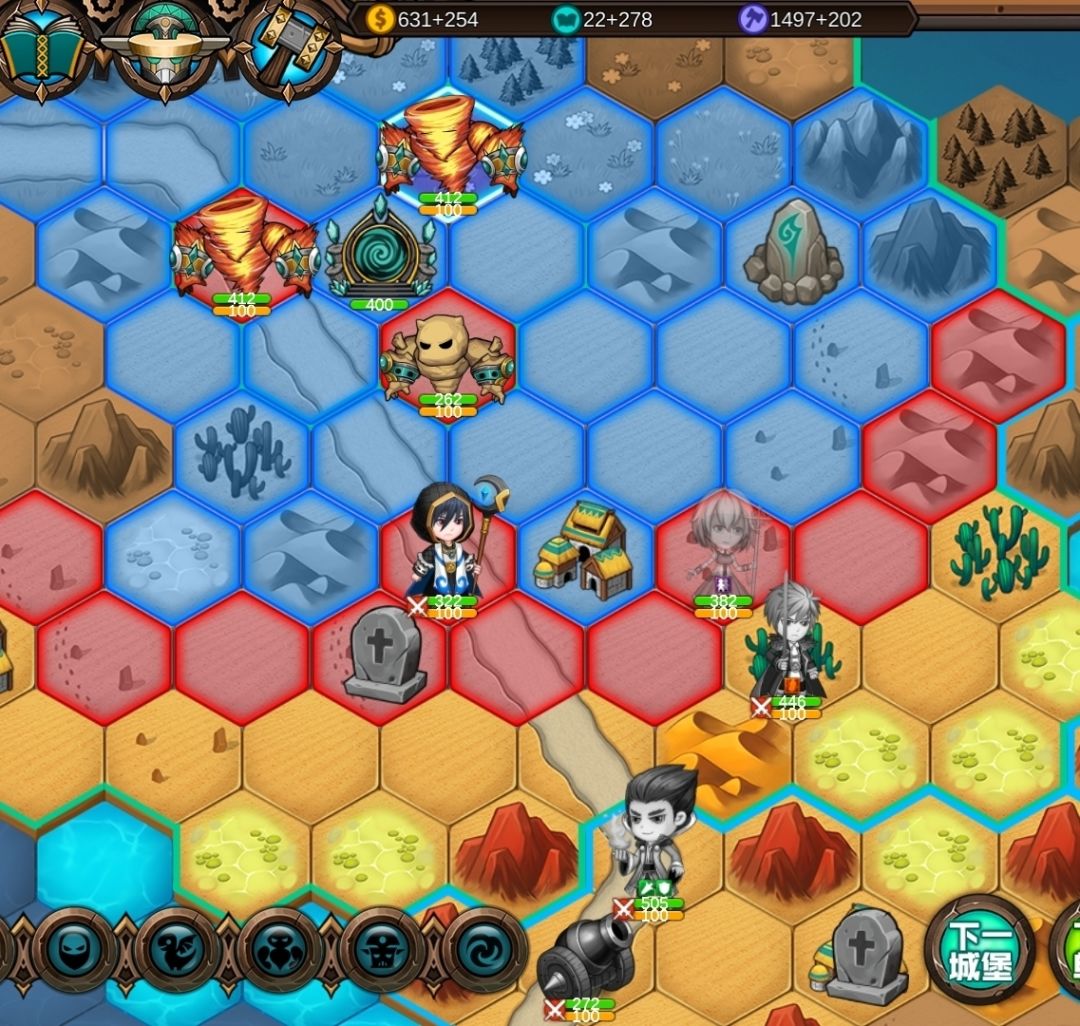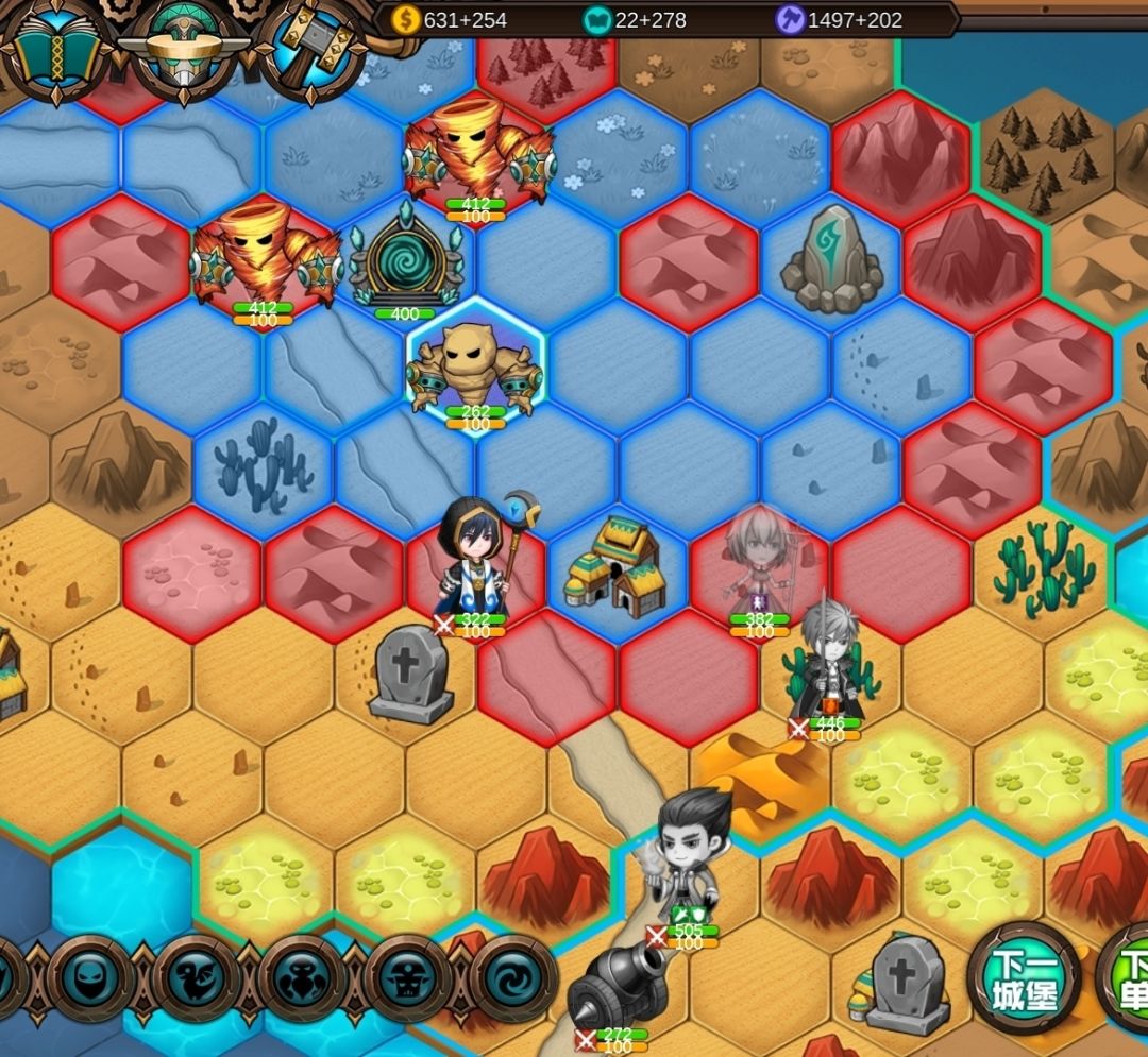 图1中土元素的移动力是4点,隐身的大牧师站在土元素移动力3的格子上让他无法下脚,从而达到土元素无法走到指挥官身边的效果