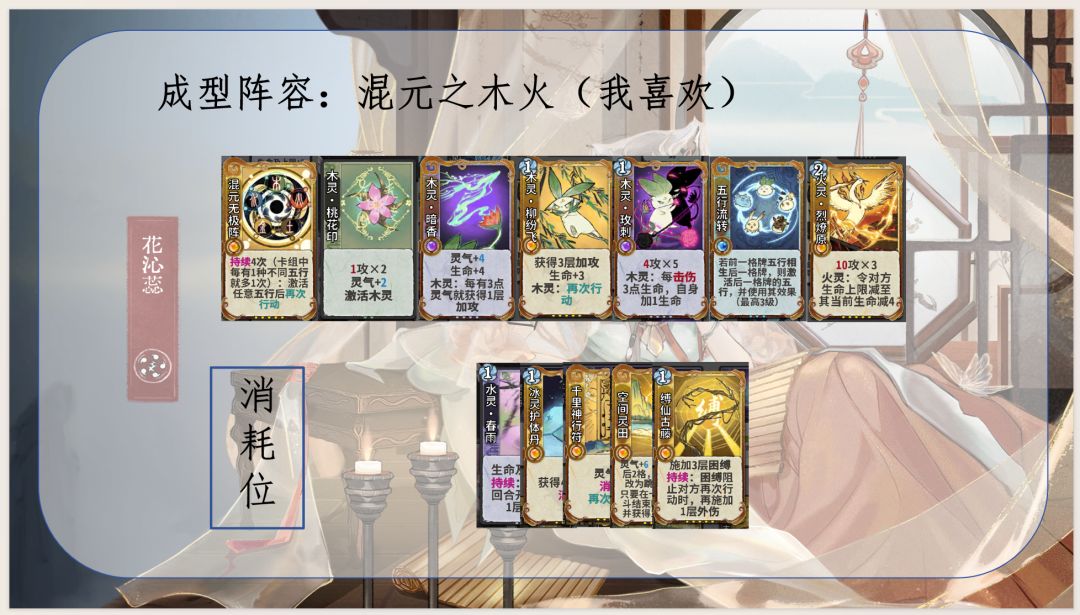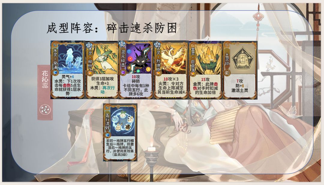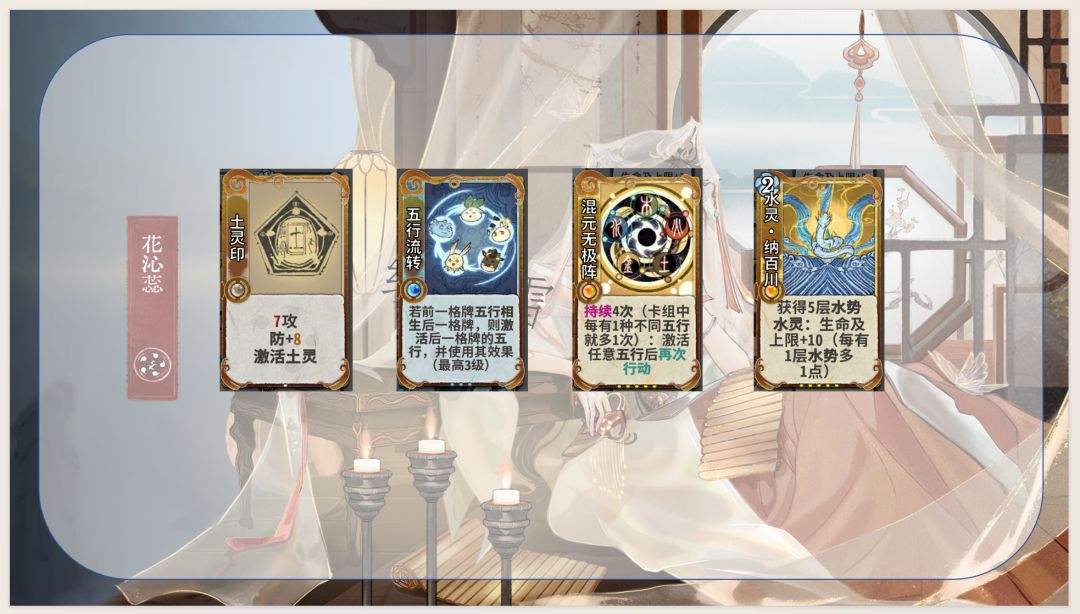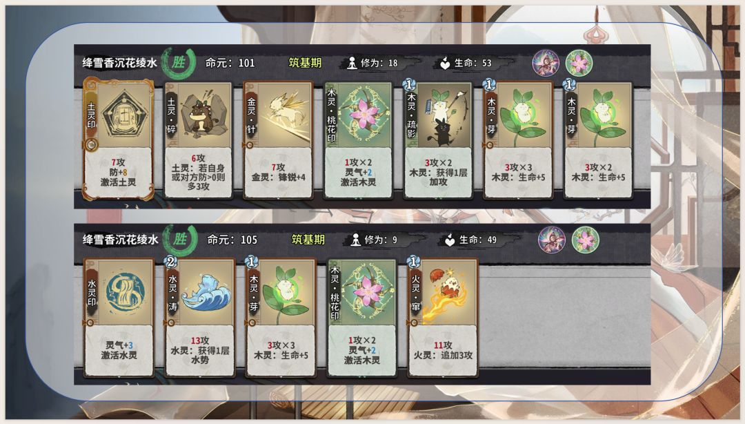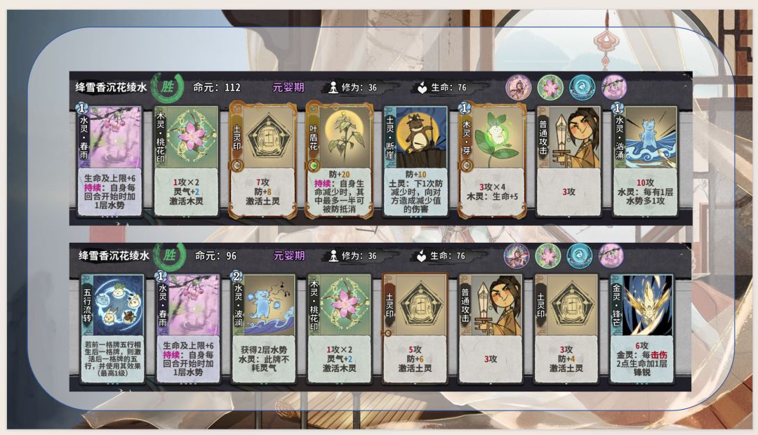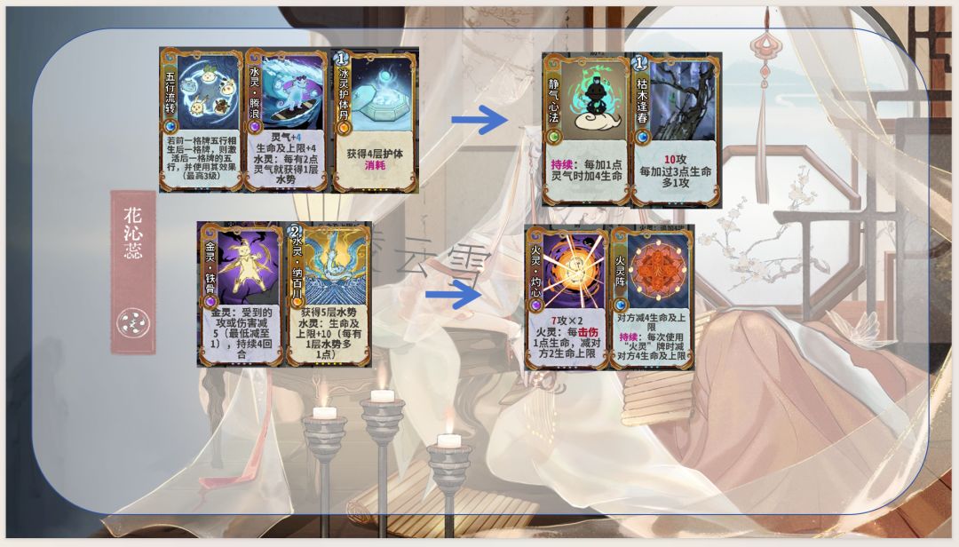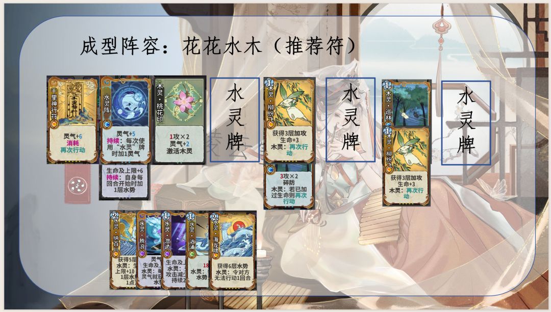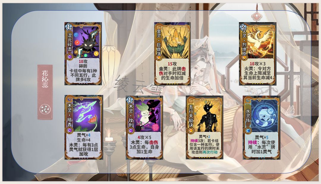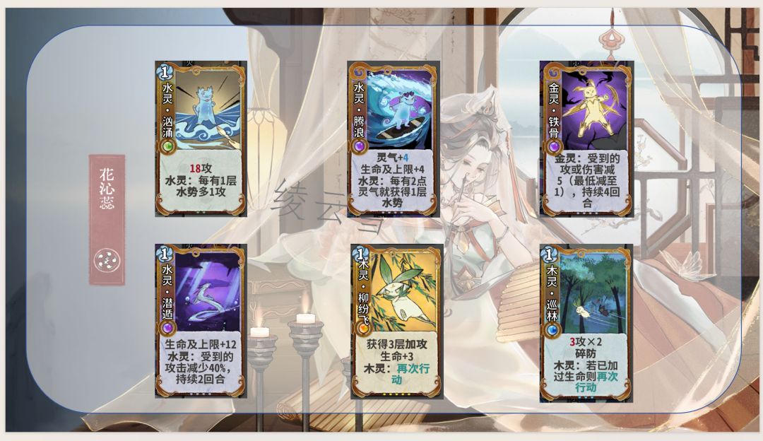 1.通过五行相生获取灵气和生命及上限,优化卡组结构并提高生存能力,同时是花沁蕊能玩水木的决定性因素:使用木灵再动牌(木灵巡林、木灵柳纷飞)不耗灵气,维持水灵牌成长速度