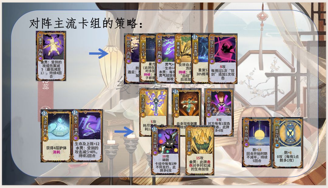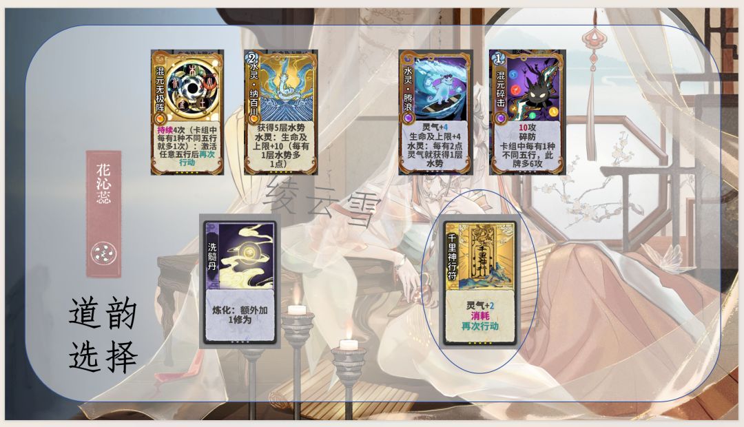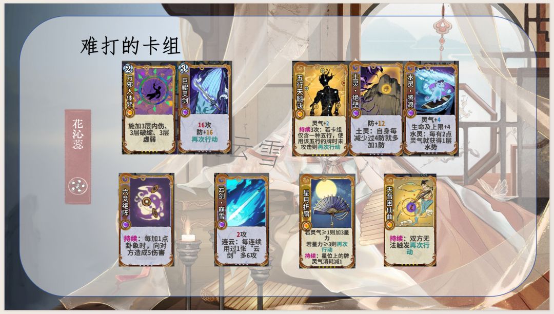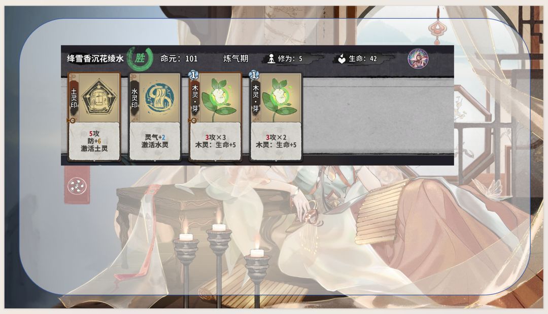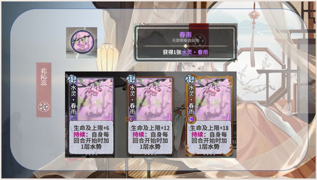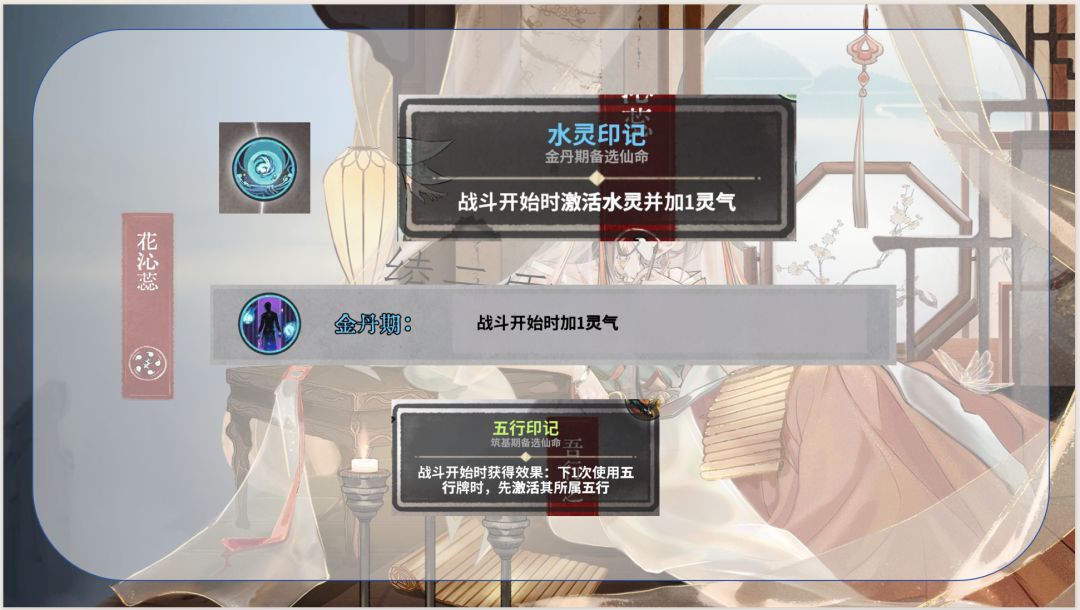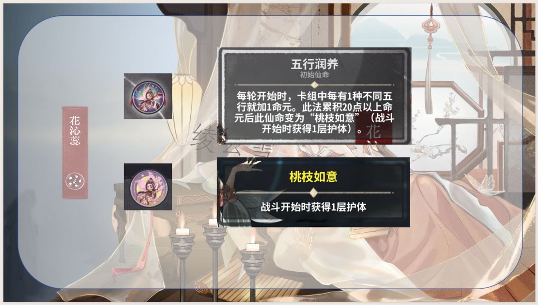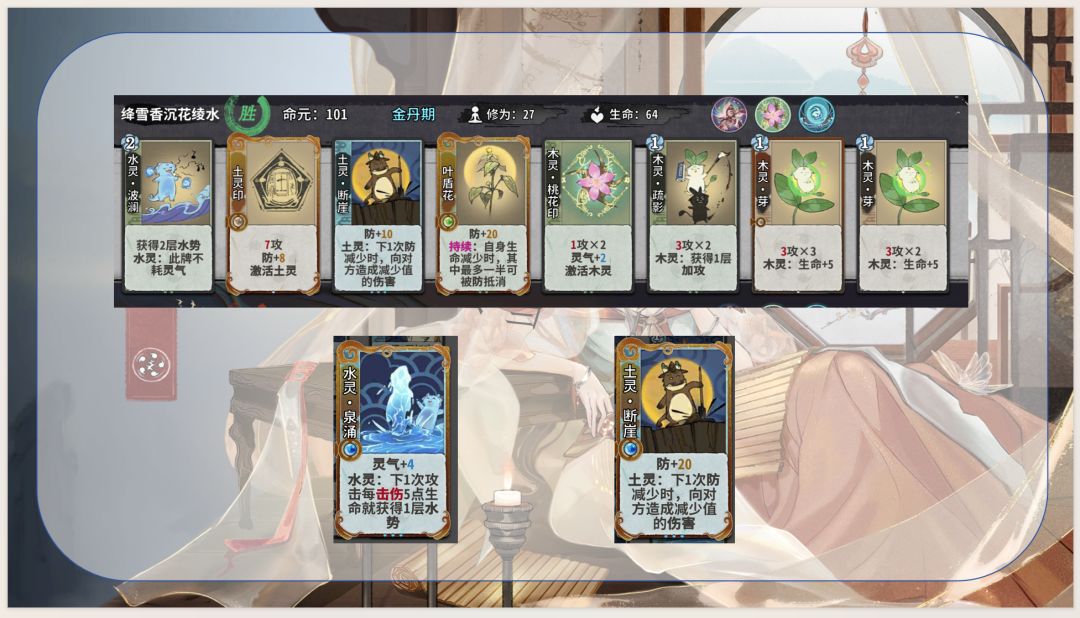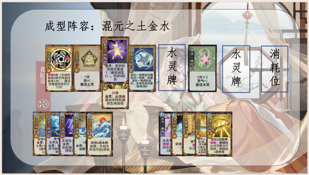 1.通过五行相生获取灵气和生命及上限,优化卡组结构并提高生存能力,同时是花沁蕊能玩水木的决定性因素:使用木灵再动牌(木灵巡林、木灵柳纷飞)不耗灵气,维持水灵牌成长速度