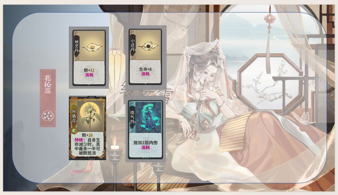 由于花花的过度、专属卡和水势紧密相关,所以拖回合数对于花花来说是很赚的,上一些有消耗属性的防御卡很不错
