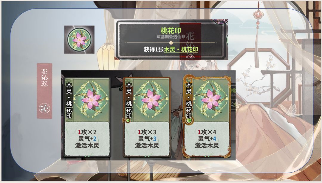 2.令木灵桃花印成为再动,即木灵桃花印前是水灵牌时再次行动(并触发第一条的效果)