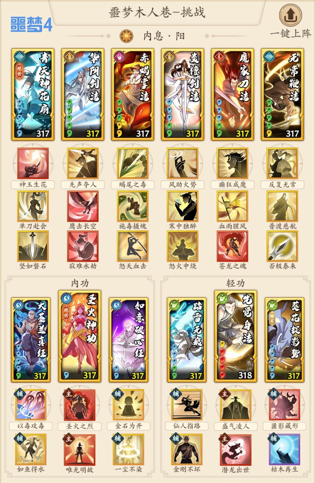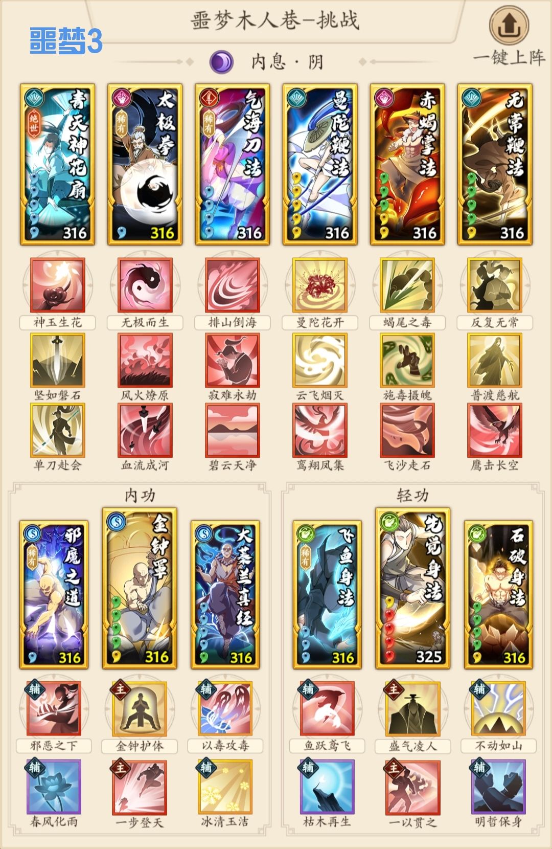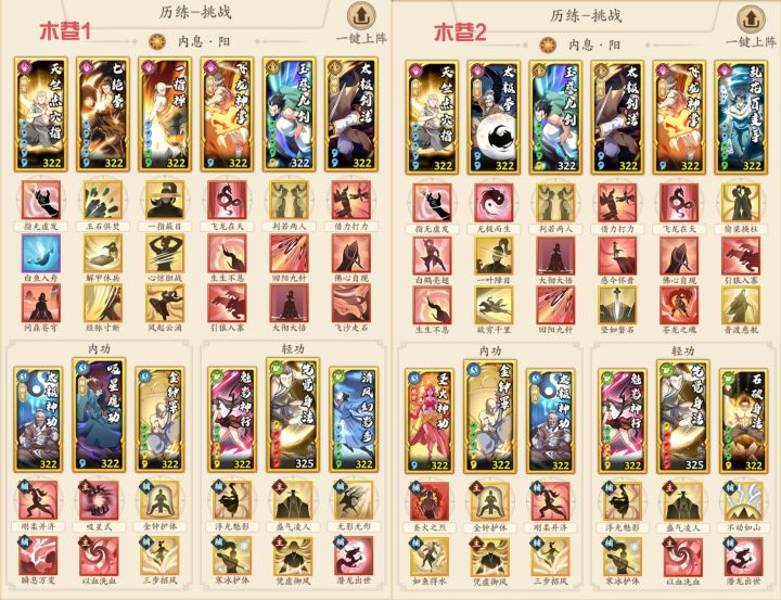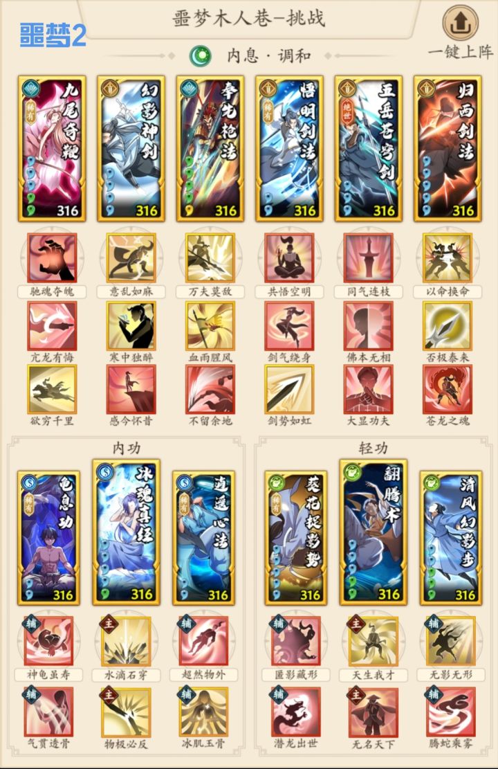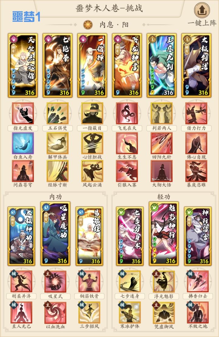 1.套路,开始我想弄6组3件套,便于应对30层以上的塔层。但实际爬塔就两种情况——要么碾压,要么每一层都要重新调,并不像木塔一劳永逸。因此,就列举噩梦4套模板相互配合,基本满足需求。噩梦1吸内套三系切换,基本不用动;噩梦2调和剑奇可以改成阴剑拳;噩梦3阴奇可以改成调和奇;噩梦4唯光明故绑定阳系没什么可改。核心就是合理分配好重点外功、内轻功、招式。