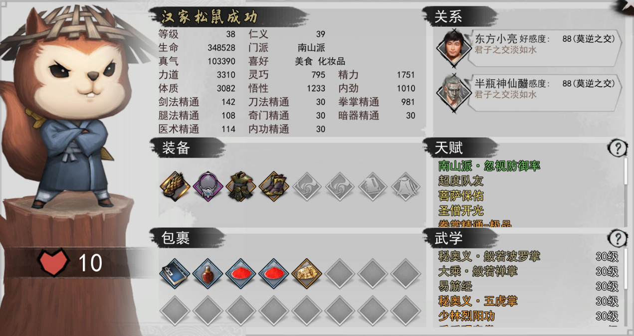 游戏里的成功是个NPC,一个小松鼠的形象让人不禁觉得有点弱,当我准备切磋一下拿点儿好东西的时候我发现我天真了,直接一招般若禅掌把我秒了,不愧是你啊成功!毕竟南山派掌门人呗。灰溜溜的我开始准备把他拉进队里嫖一波天赋和武学,一看他竟然喜欢化妆品???你一个大男人要化妆品干嘛?难不成要女装?是将来公测的福利嘛?不得不说现在有点期待了!