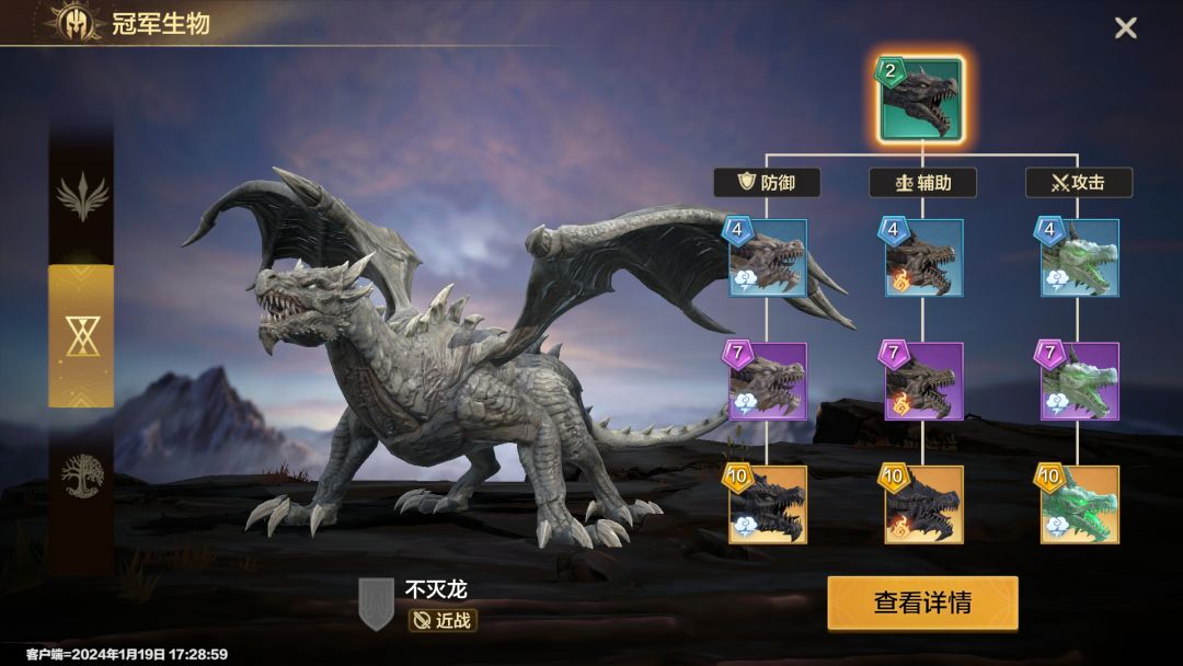 冠军生物按阵营不同,分为圣堂的光明者、暮园的不灭龙和森林的森林龙三种基础冠军生物,每种又具有三种分支进阶路线,本期凯莉就为大家介绍一下暮园阵营的冠军生物——不灭龙。