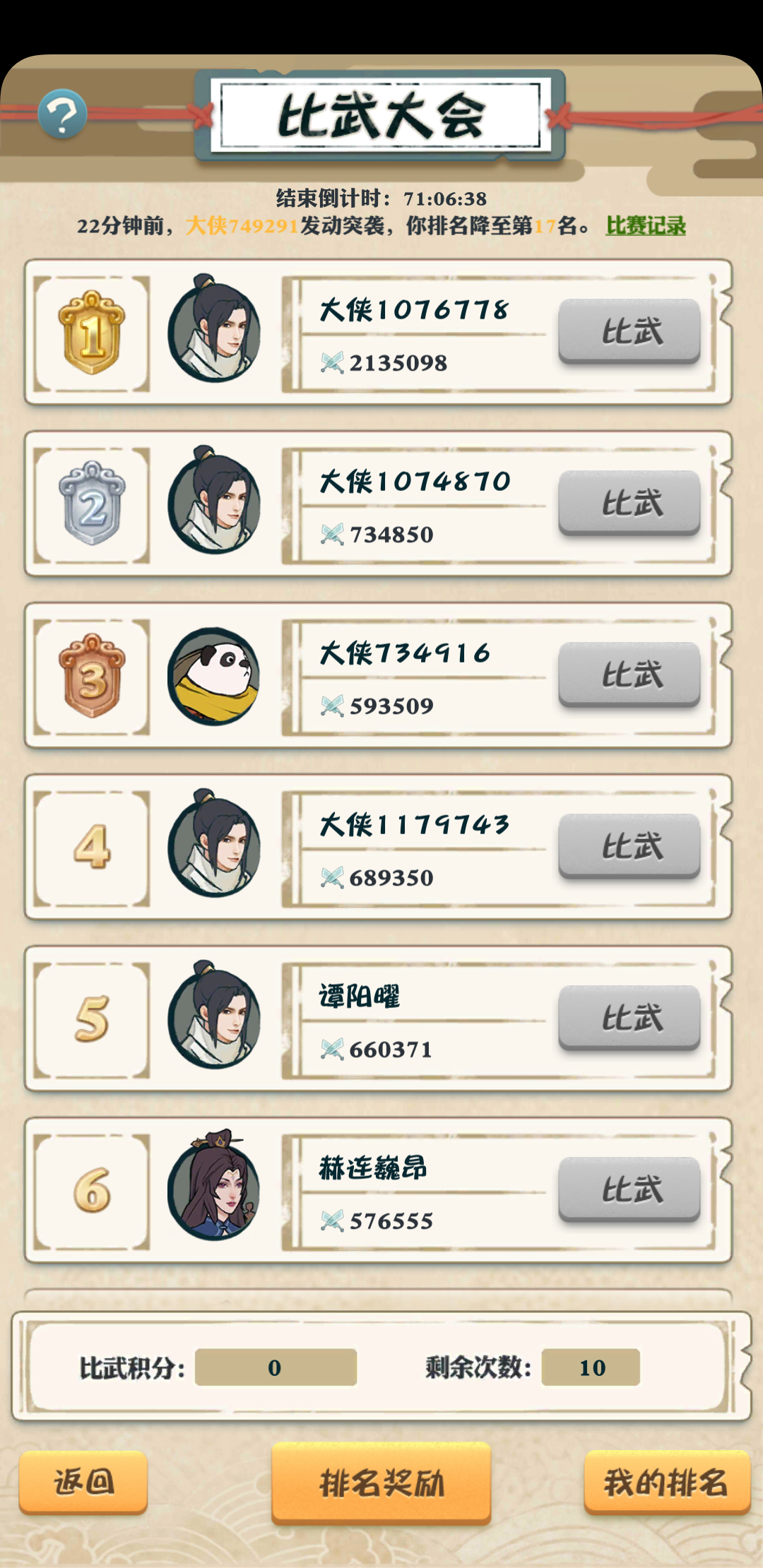 第二和我差十几万战斗力,这第一的稳稳妥妥挂机3天不上线都还是稳坐第一,我们拼命肝都赶不上。这匹配天下大会简直没谁了