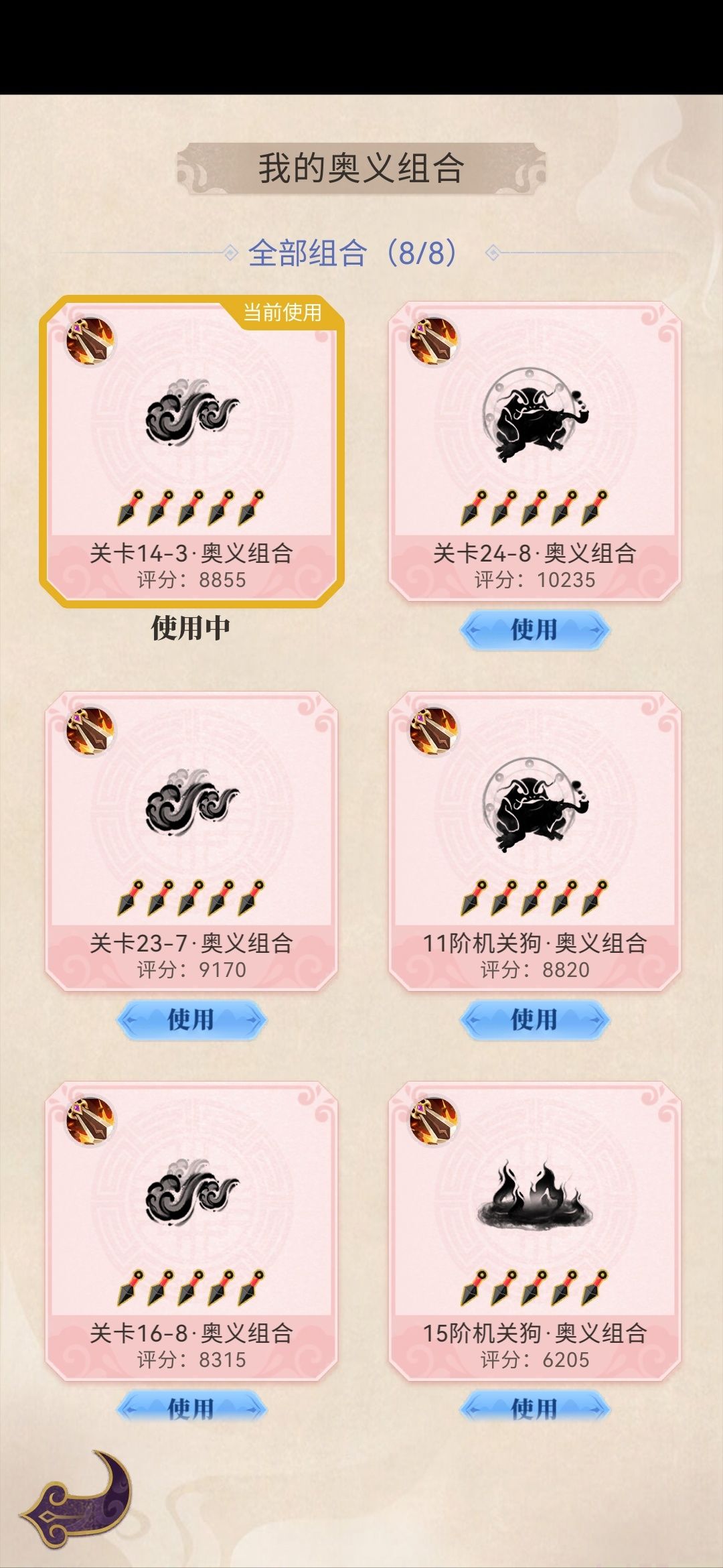 战斗中会选择卷轴,也就是我们的奥义,部分主奥义还有附属奥义卷轴,最后就是通用的奥义卷轴(这类卷轴通常会增加白刃在战斗中的属性)。比如分身术(核心奥义)+疾影镖、修罗符(附属奥义),在关卡内选齐后可以增加奥义造成的伤害10%。