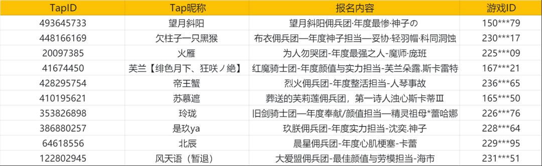经过对报名问卷的初步核筛,共计10位玩家入围,现将本期年度(人气)佣兵入围名单公示如下: