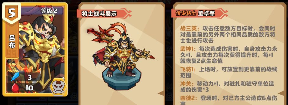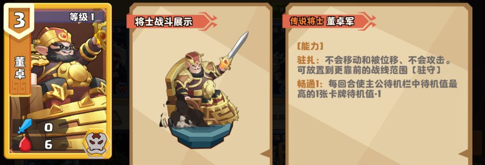 董卓是待机值为3的驻扎将士,可以在8000杯以后的战场中获得。他初始的身材为0/6,是妥妥放在召唤区最后一排的“吉祥物”【驻扎】单位。