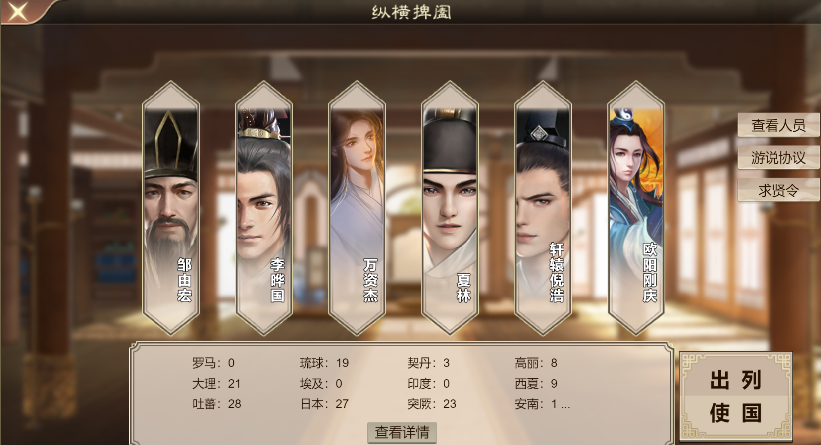 ※ 开局时国家方针选择有「纵横·四方纵使」,即可在「东市 - 集贤院 - 百家成就」中进入「纵横捭阖」功能