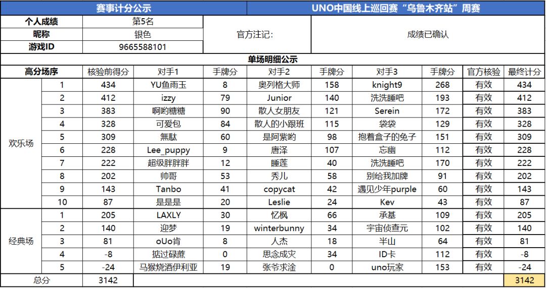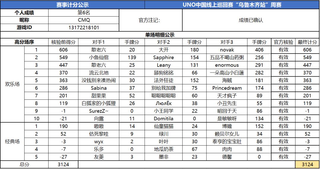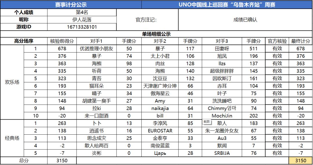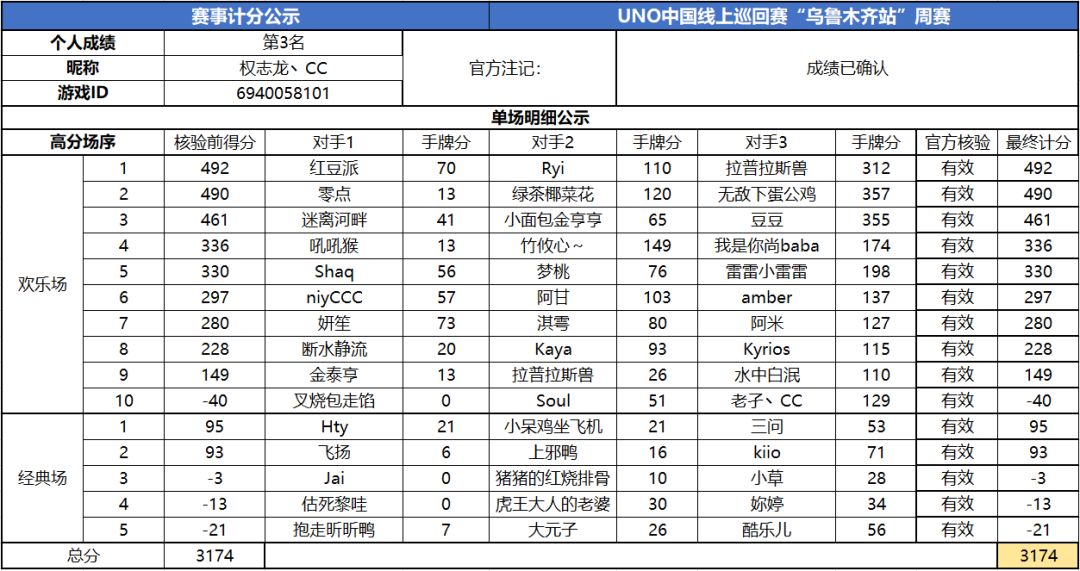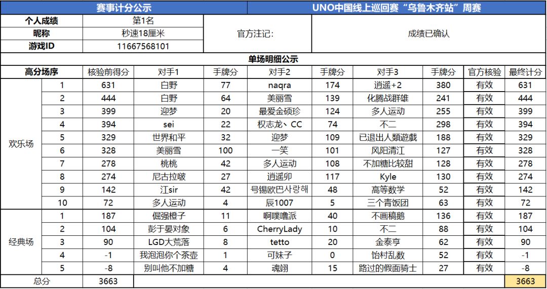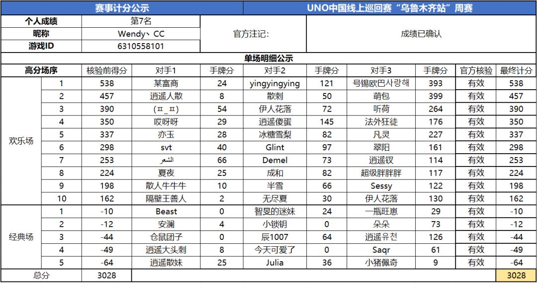 以上就是2020UNO线上巡回赛“乌鲁木齐站”周赛的战报内容啦,为了保证我们巡回赛的公平公正,根据规则,至少完成10场欢乐场及5场经典场的玩家才会判定完成本站巡回赛,而利用多开或其他违规操作的选手我们也会取消本次巡回赛成绩。