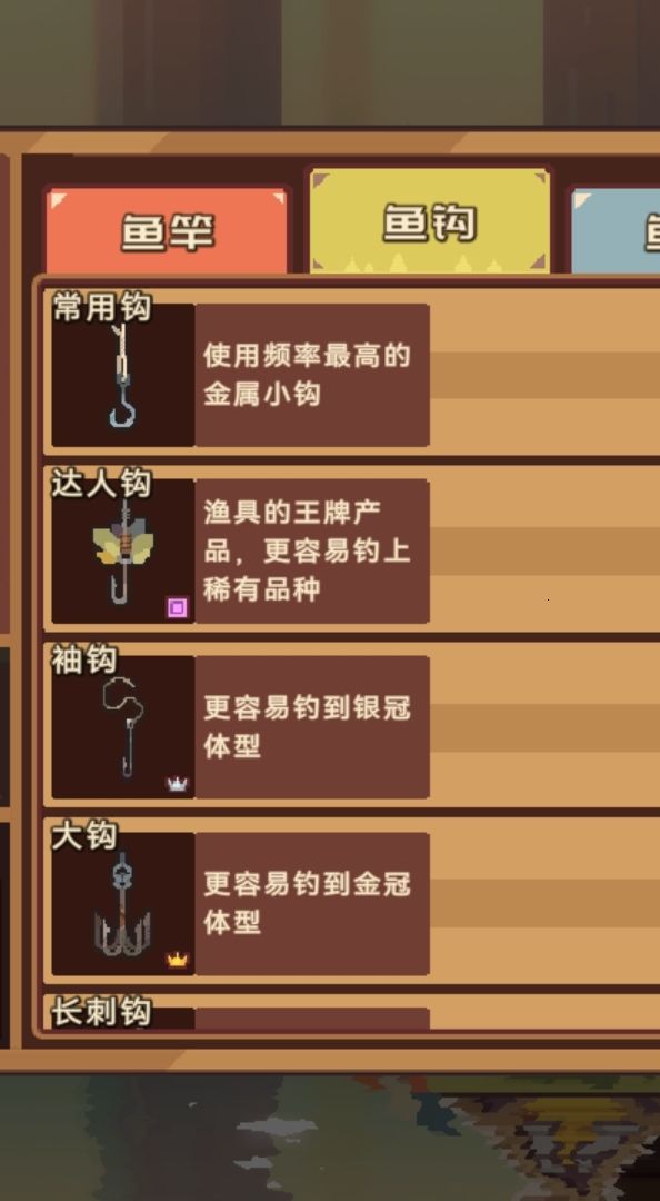 当我们钓到上面图鉴这个鱼的最短长度时就会显示银冠标志,反之钓到最长就会显示皇冠,掉到一种冠在图鉴里可得1块石头,也就是每条鱼钓到最长和最短长度算是集齐这种鱼图鉴,总共可得两块石头。有的鱼饵的解锁是根据某种鱼集齐条件才能解锁的,所以大家需要根据不同鱼竿介绍的可钓长度搭配不同钩子使用,前期杆子都没升级,所以钓出垃圾概率特别大,这不用担心,毕竟钓垃圾才能解锁杆子![[表情_捂脸哭]](https://img.tapimg.com/market/images/83aa452eea88b5c64df710bca367b7e9.png)