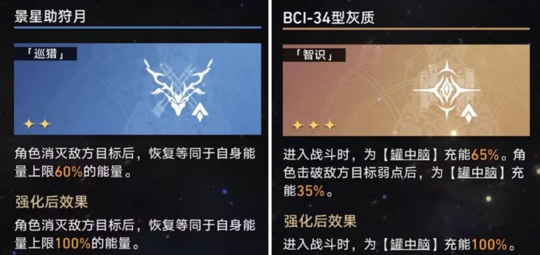 (3)再带三个终结技没伤害的辅助,祝福需要强化的【景星助狩月】和【BCI-34型灰质】(其他给罐中脑充能的都能拿)