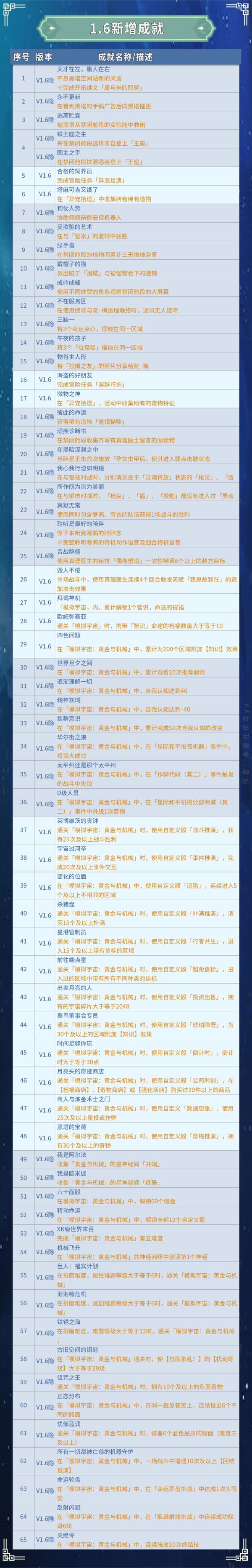 (1)截止1.6版本,成就共596个,版本新增65个