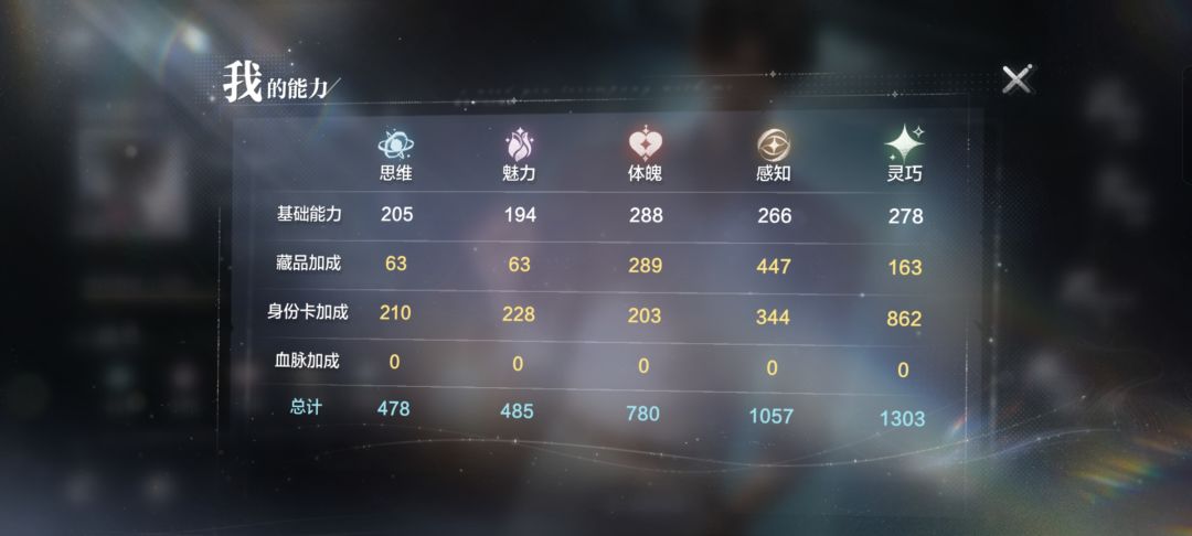 玩家共五种基础属性,如图示,由基础能力、藏品加成、身份卡加成、血脉加成这四层组成,而过关则是在此基础上加上侧影加成。
