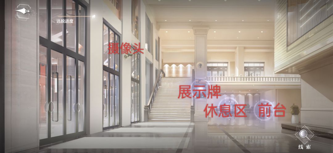 摄像头处“查看摄像头”—展示牌处“观察”—休息区处“走进”—“拾起”—前台处“观察”—“照射小孔”—“拿出卡片”(顺序不重要)