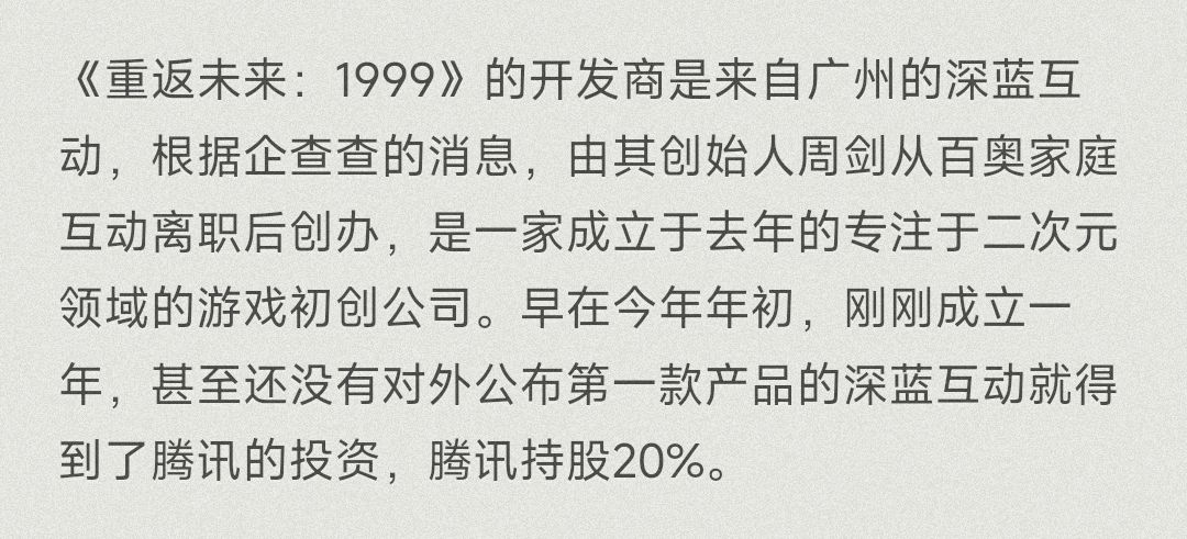 我想正因为腾讯代理过《食物语》,才在周创业初期就给了很大的支持(深蓝后续还接收了网易、鹰角、悠星的投资)。