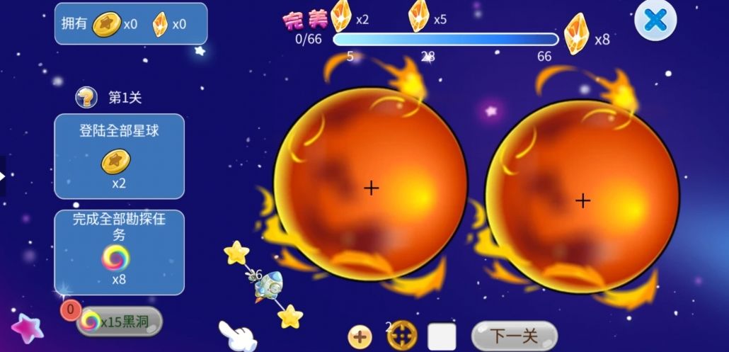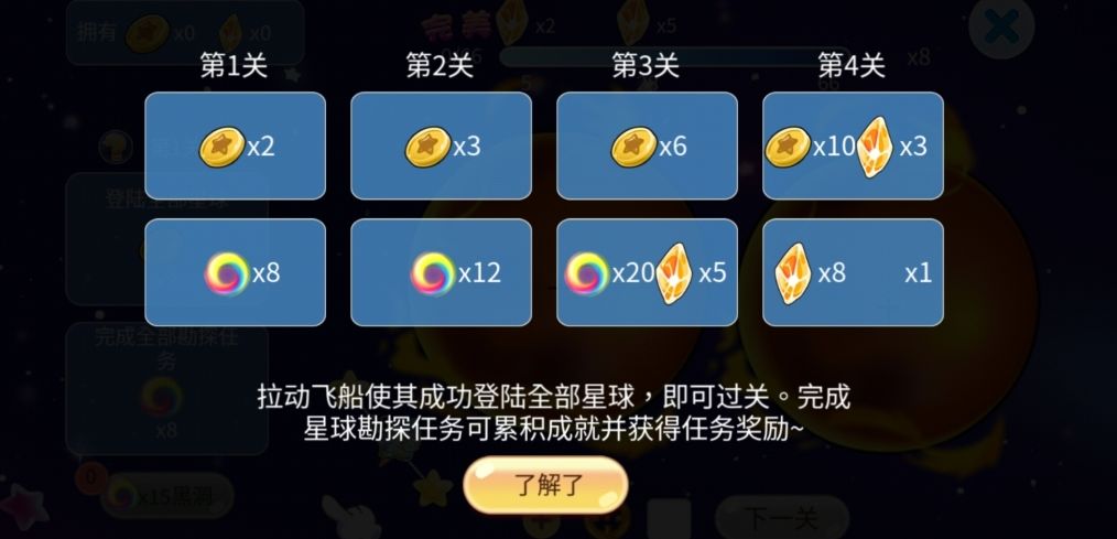 拉动飞船使其成功登陆全部星球即可过关,拉动的方向和力度将直接决定飞船能否成功登陆,要注意哦。