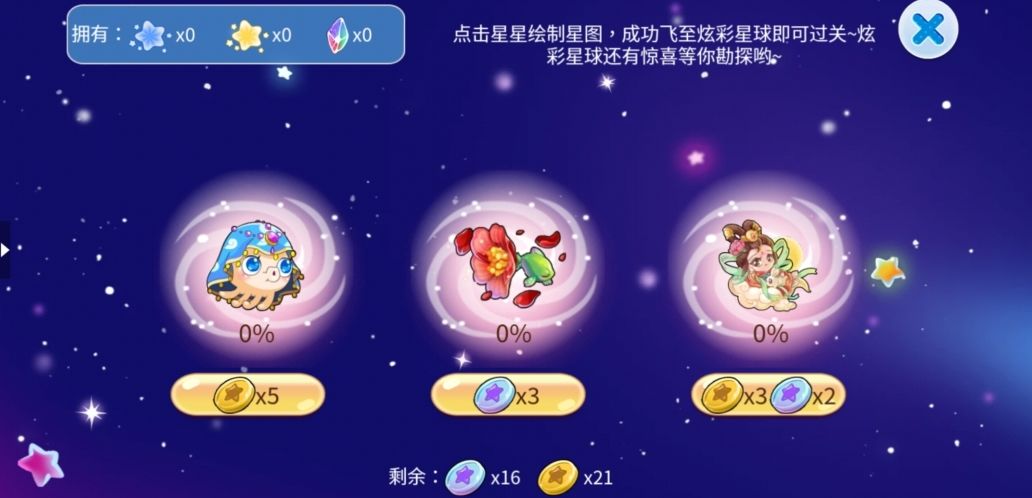 点击星星绘制星图,成功达到炫彩星球即可过关,在炫彩星球上有机会触发惊喜。