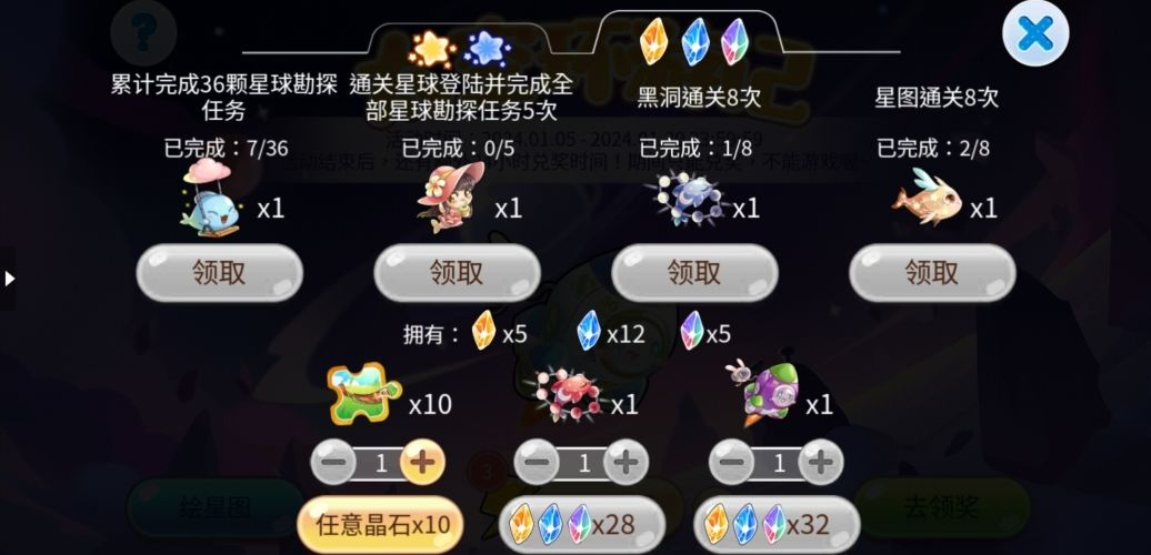 地图里面包含3个不同的星系,点击对应的星系即可进入星图绘制,当进度达到100%时,可以获得对应奖励。