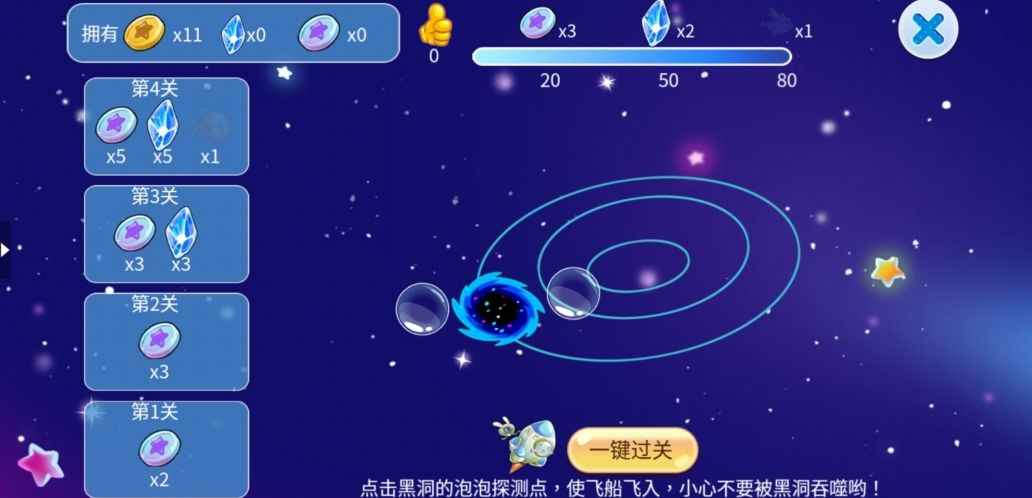 当拥有足够数量的能量球后,即可前往黑洞探索。点击黑洞旁边的泡泡让飞船进入,要当心被黑洞吞噬的危险!