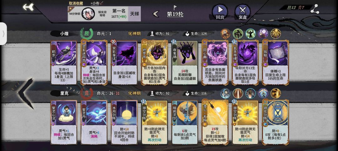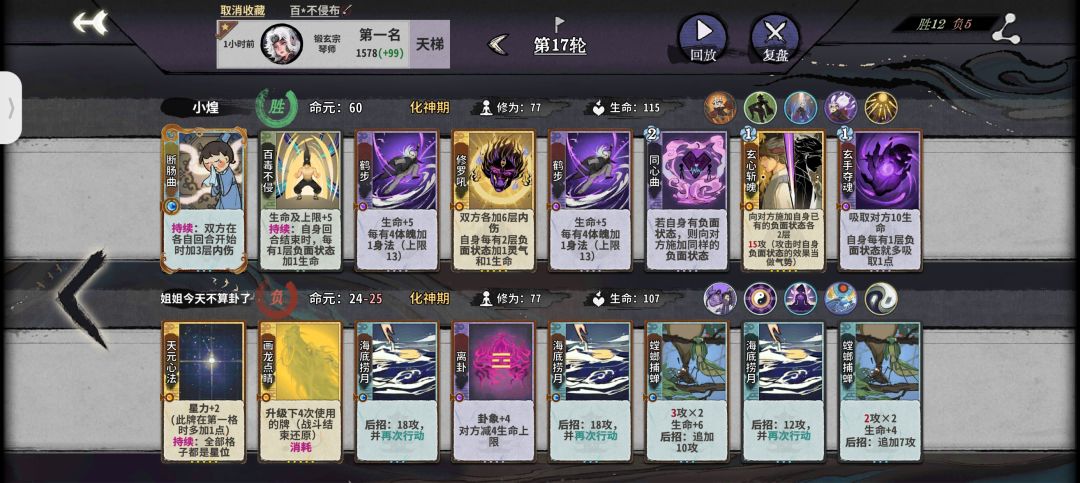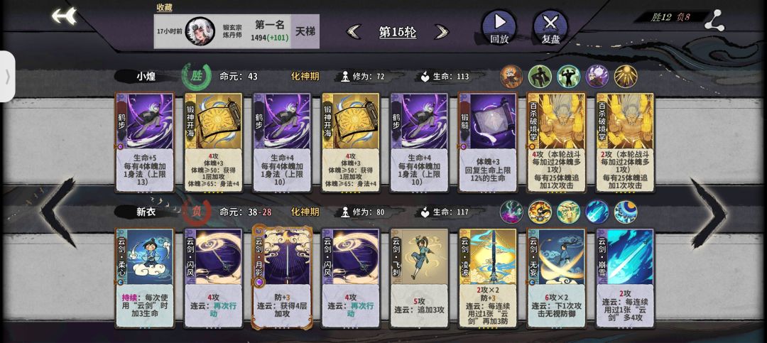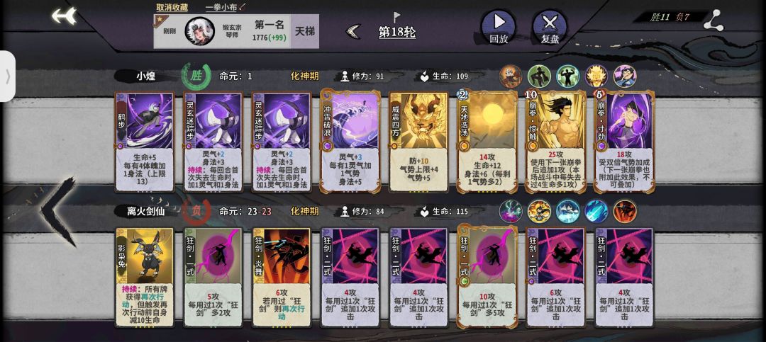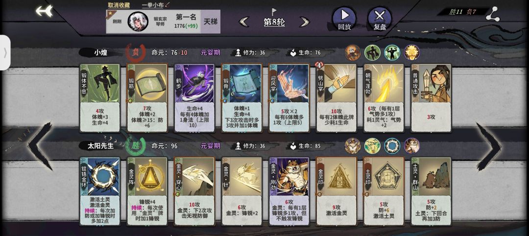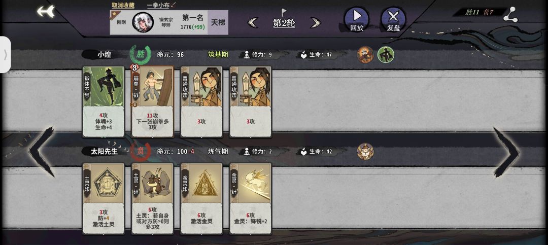 前期:鹤步是小布的核心牌,所以体魄非常重要,一般情况我们都要把它升到64以达到三级鹤步的需求,所以我们前期直接走锻体流拉体魄,一级牌随便上,第二回合我们直接卖牌升筑基拿到自带仙命开始叠体魄