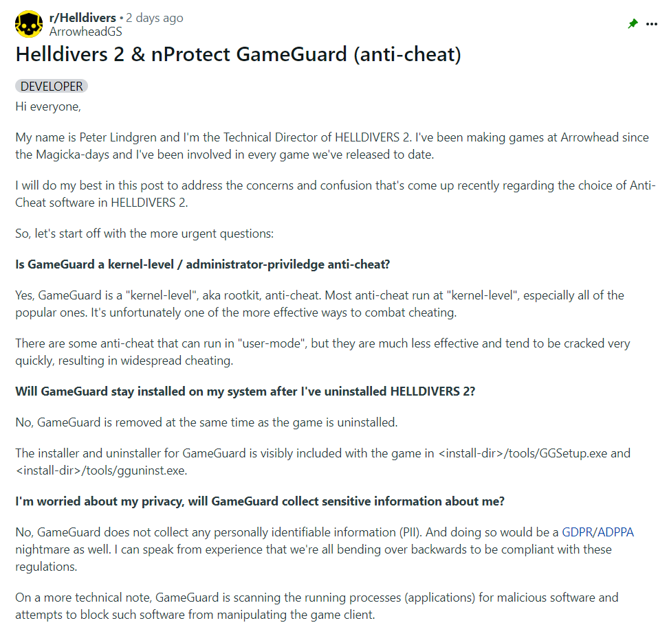 多人射击游戏《地狱潜者2》即将在2月8日正式发售,近日游戏的技术总监Peter Lindgren在国外论坛reddit上分享了与反作弊程序nProtect GameGuard相关的问答。