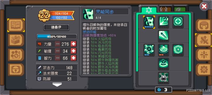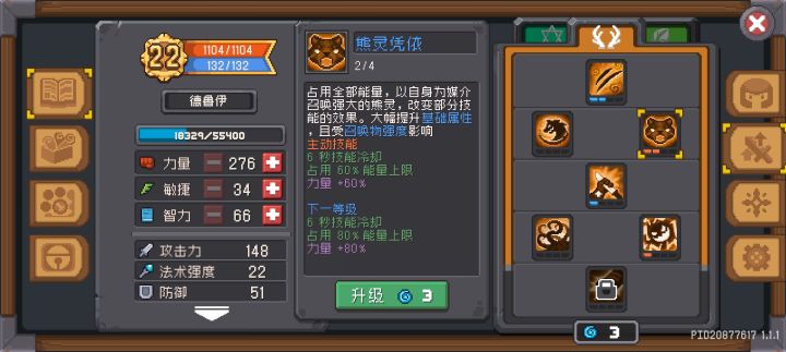 德鲁伊最强的一点在于熊灵凭依是以召唤物的方式加强自身,而召唤物是锁面板的,再加上通灵师的技能灵能同步,召唤物继承50%的附加属性。所以我们可以在开启熊灵凭依前疯狂叠buff,比如我们的光环技能,坚韧,狂化灵药等,甚至是队友的光环,副本的雕像。在开启熊灵凭依后,只要不关闭技能,我们可以一直保留这些附加属性的50%。升到四级附加100%力量属性,强韧叠满后再开始技能,力量点能破千。如图我叠了一下副本的自然雕像,就算雕像效果消失任然能在22级,装备没有任何毒伤加成的情况下做到106的毒伤加成。
