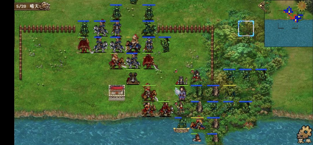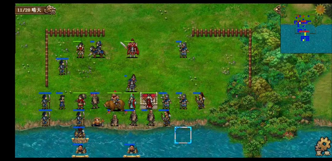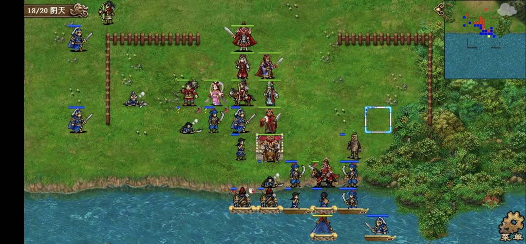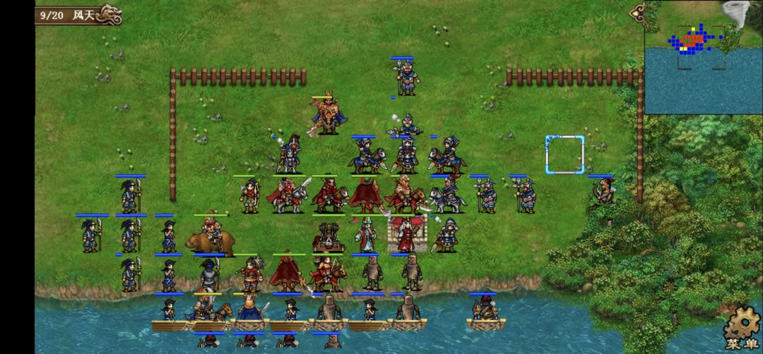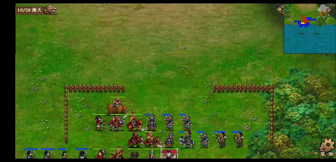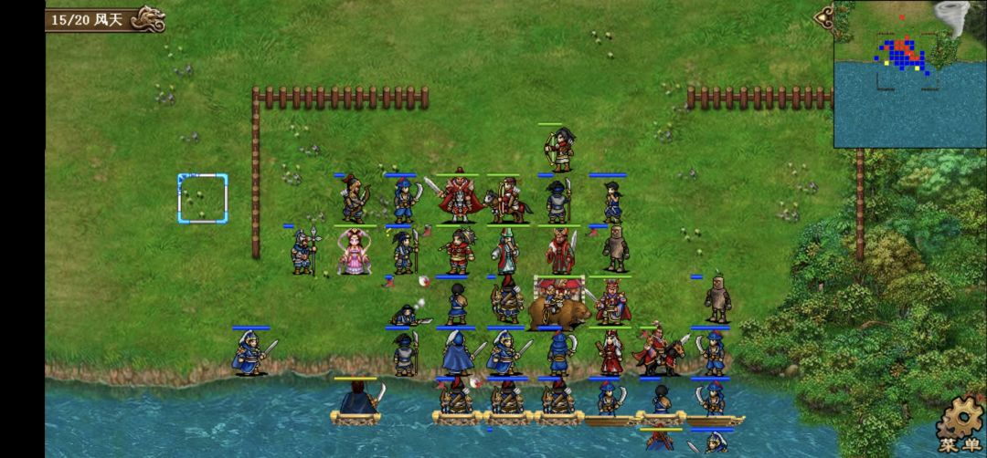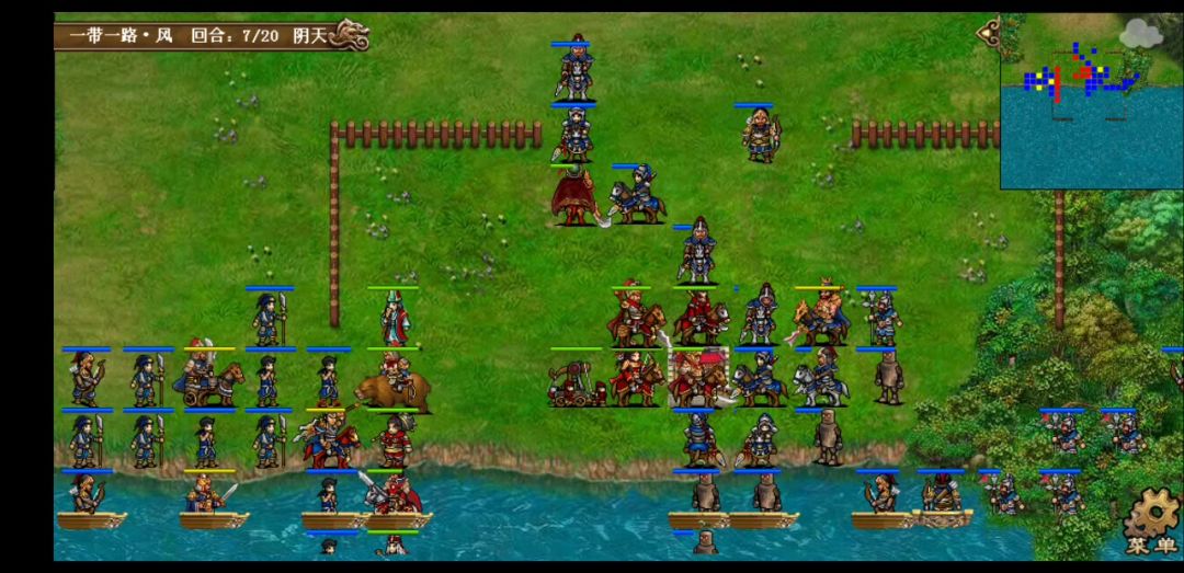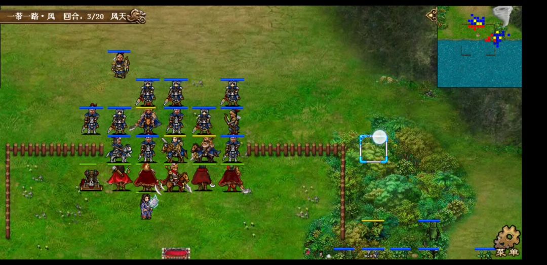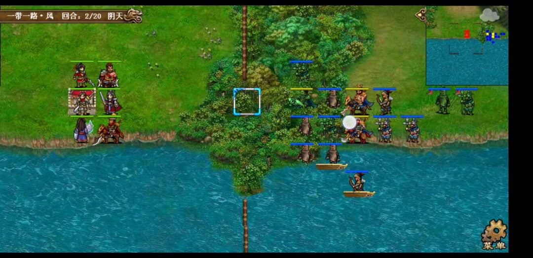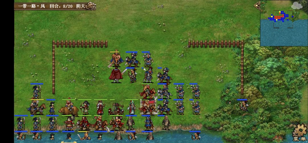 第一回合。给贾诩上强行,贾诩去给刘备左侧的枪兵毒雾,邓艾到贾诩身后给刘备身前的两个小兵电痹(这样刘备就会到一线)两人退回原位,其他人互上强行。保持回合初阵型等待敌军进攻。