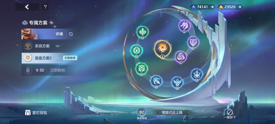 绿色选择勇气,长生和强韧,许褚属于是究极肉盾级别的,因此在选择上我们优先选择坦度类星石,同样,如果对面控制较少可以把强韧换成机敏,仅出守护之翼即可。